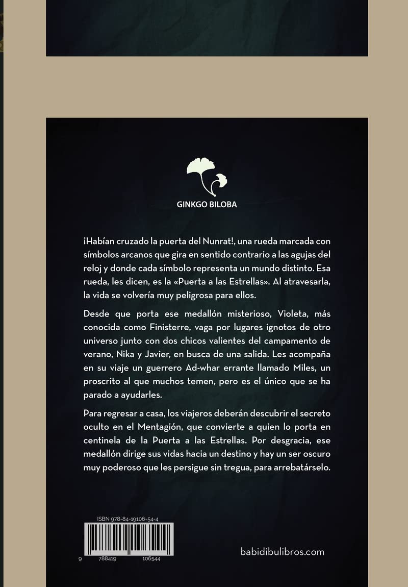 Adéntrate en un viaje fantástico por mundos desconocidos y peligrosos de otro universo para descubrir el secreto oculto en el Mentagión.¡Habían cruzado la puerta del Nunrat!, una rueda marcada con símbolos arcanos que gira en sentido contrario a las agujas del reloj y donde cada símbolo representa un mundo distinto. Esa rueda, les dicen, es la «Puerta a las Estrellas». Al atravesarla, la vida se volvería muy peligrosa para ellos.Desde que porta ese medallón misterioso, Violeta, más conocida como Finisterre, vaga por lugares ignotos de otro universo junto con dos chicos valientes del campamento de verano, Nika y Javier, en busca de una salida. Les acompaña en su viaje un guerrero Ad-whar errante llamado Miles, un proscrito al que muchos temen, pero es el único que se ha parado a ayudarles.Para regresar a casa, los viajeros deberán descubrir el secreto oculto en el Mentagión, que convierte a quien lo porta en centinela de la Puerta a las Estrellas. Por desgracia, ese medallón dirige sus vidas hacia un destino y hay un ser oscuro muy poderoso que les persigue sin tregua, para arrebatárselo.