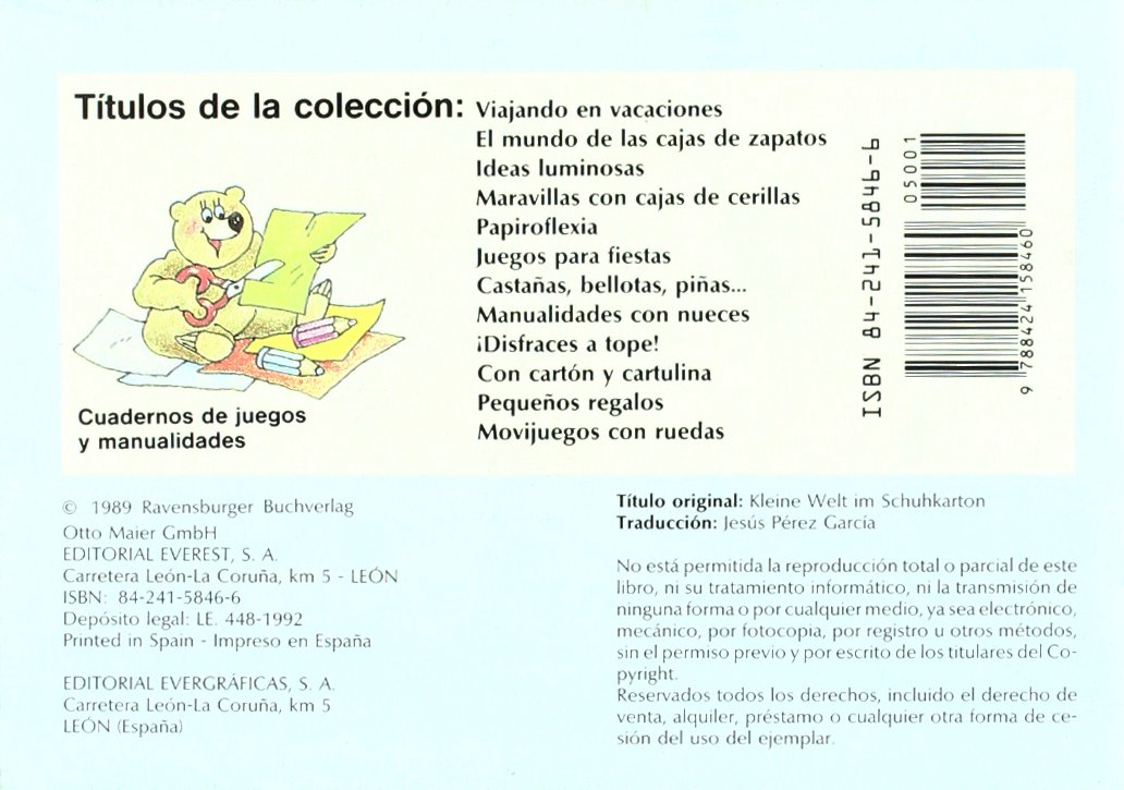 Las cajas de cartón pueden resultar maravillosas. En este cuadernillo puedes encontrar una caja indiscreta con un jardín encantado, un castillo lleno de fantasmas, un completo guiñol, una jaula con un cocodrilo, un complicado laberinto y un abejorro muy especial para tus amigos. Así que, ¡venga, a por las cajas! Si en casa no encuentras las cajas de zapatos adecuadas, seguro que te regalan algunas en la zapatería. Necesitas pegamento y un cuchillo para tus trabajos manuales. ¿Deja que te ayude alguna persona mayor en las cosas difíciles!