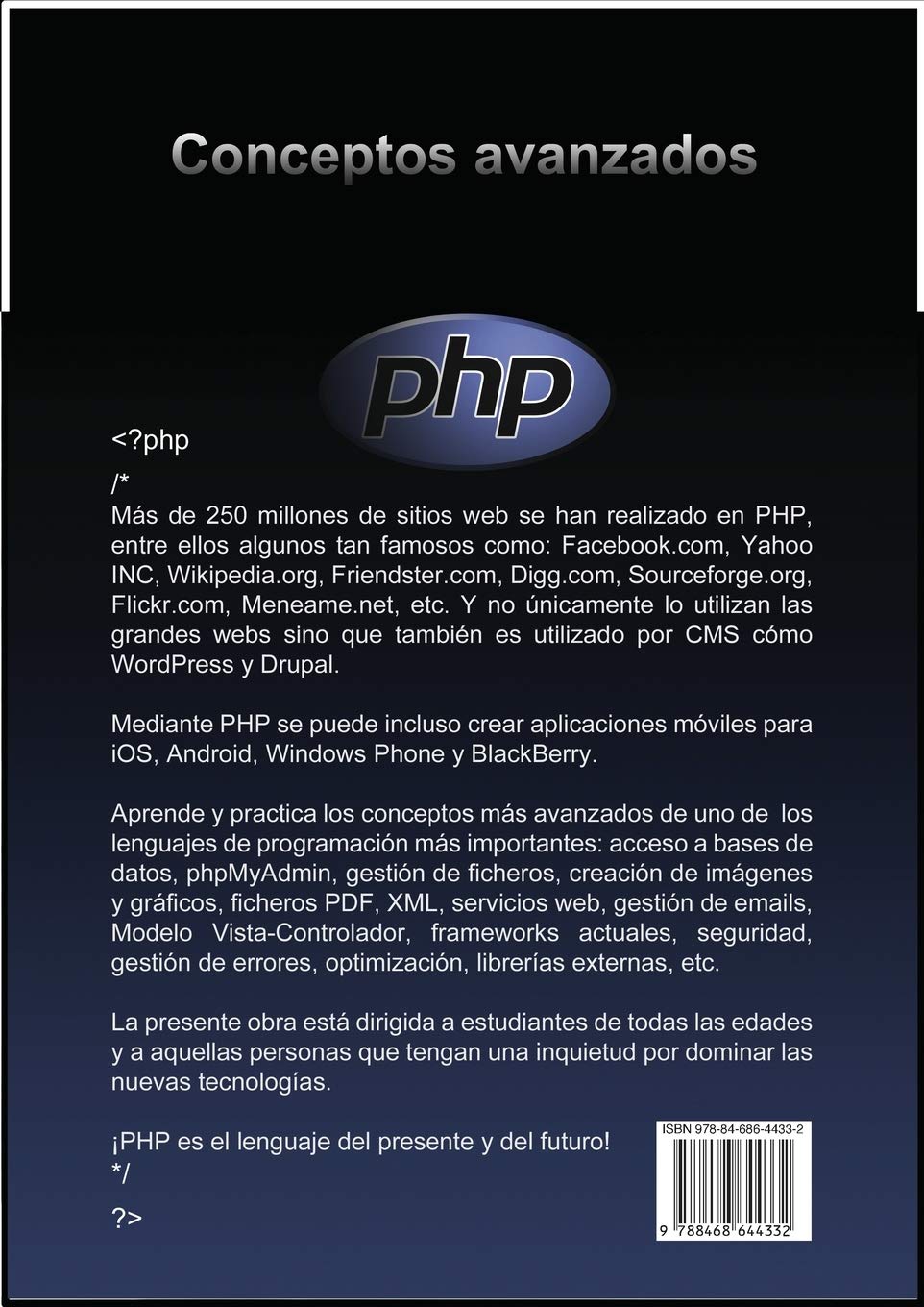 Más de 250 millones de sitios web se han realizado en PHP, entre ellos algunos tan famosos como: Facebook.com, Yahoo INC, Wikipedia.org, Friendster.com, Digg.com, Sourceforge.org, Flickr.com, Meneame.net, etc. Y no únicamente lo utilizan las grandes webs sino que también es utilizado por CMS cómo WordPress y Drupal.Mediante PHP se puede incluso crear aplicaciones móviles para iOS, Android, Windows Phone y BlackBerry.Aprende y practica los conceptos más avanzados de uno de los lenguajes de programación más importantes: acceso a bases de datos, phpMyAdmin, gestión de ficheros, creación de imágenes y gráficos, ficheros PDF, XML, servicios web, gestión de emails, Modelo Vista-Controlador, frameworks actuales, seguridad, gestión de errores, optimización, librerías externas, etc.La presente obra está dirigida a estudiantes de todas las edades y a todas aquellas personas que tengan una inquietud por dominar las nuevas tecnologías.¡PHP es el lenguaje del presente y del futuro!