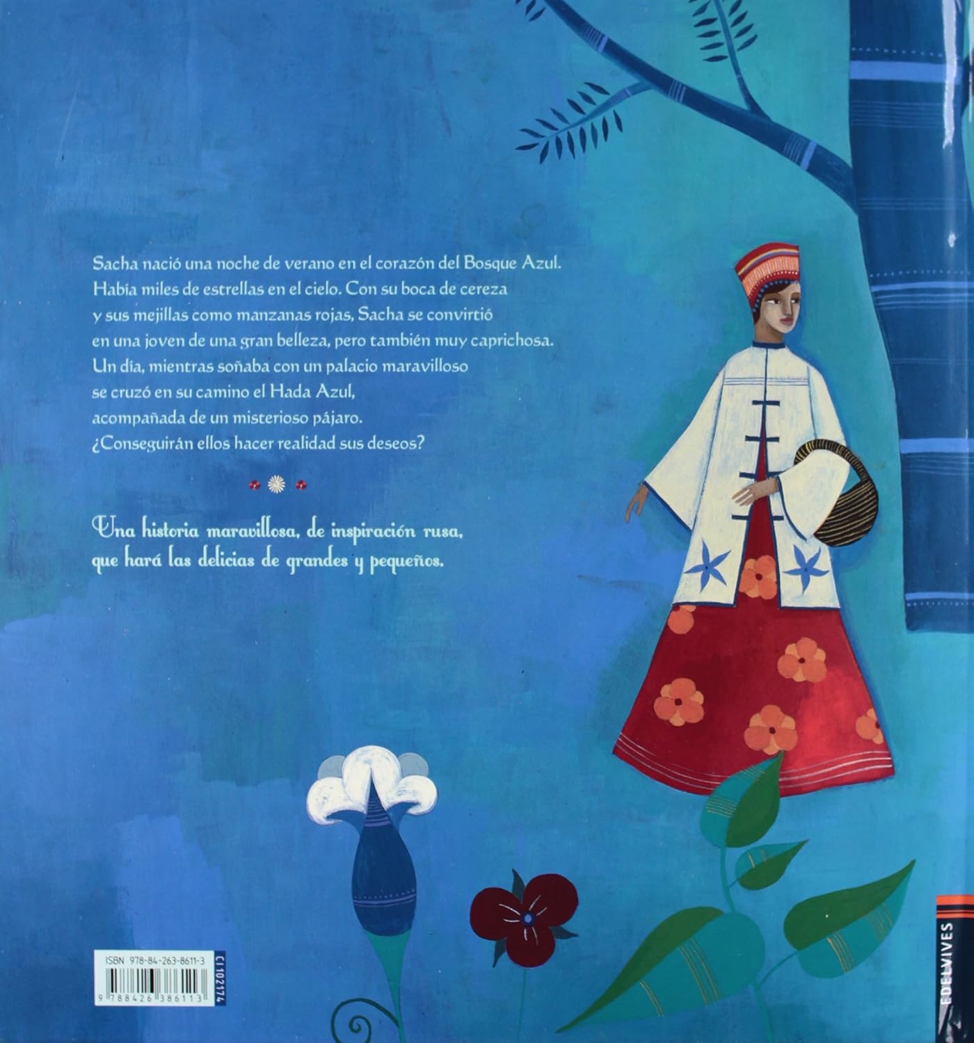 Sacha nació una noche de verano en el corazón del Bosque Azul. Había miles de estrellas en el cielo. Con su boca de cereza y sus mejillas como manzanas rojas, Sacha se convirtió en una joven de una gran belleza, pero también muy caprichosa. Una historia maravillosa, de inspiración rusa, que hará las delicias de grandes y pequeños. El álbum viene dentro de una caja que se convierte en una caja de muñecas e incluye los personajes troquelados.