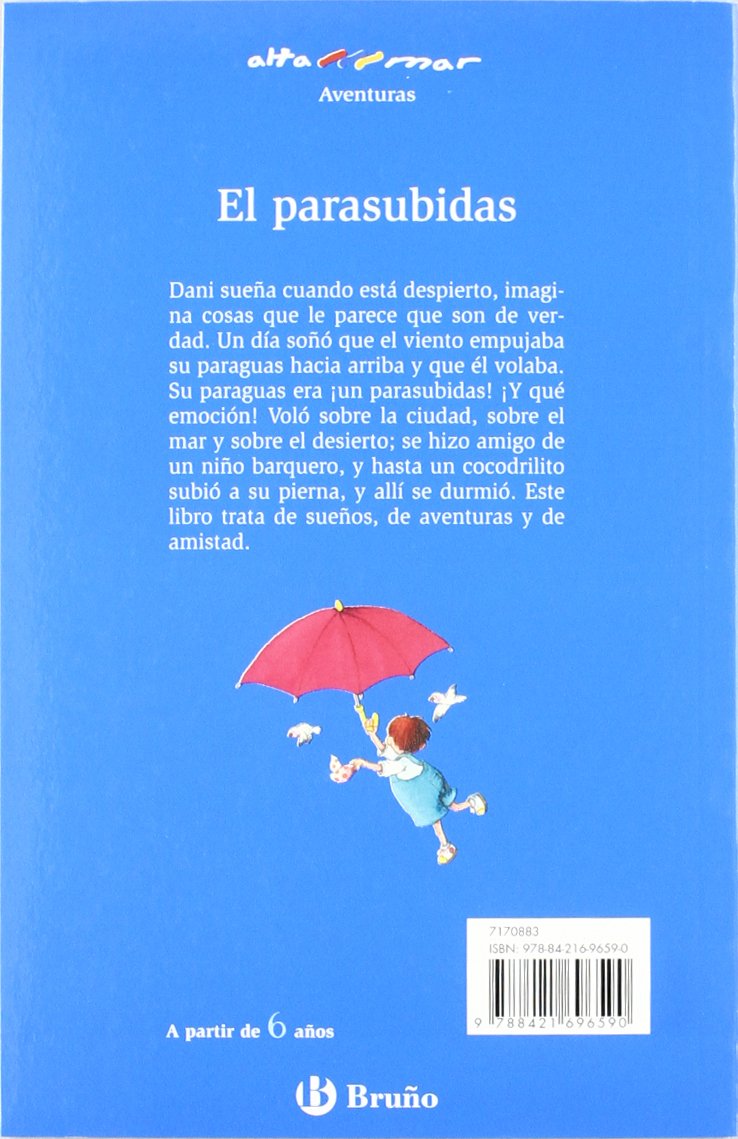 Dani sueña cuando está despierto, imaginando cosas que le parece que son de verdad. Un día soñó que el viento empujaba su paraguas hacia arriba y que él volaba. Su paraguas era ¡un parasubidas! ¡Y qué emoción! Voló sobre la ciudad, sobre el mar y sobre el desierto; se hizo amigo de un niño barquero, y hasta un cocodrilito se subió a su pierna, y allí se durmió. Este libro trata de sueños, de aventuras y de amistad. Dispone de Juego de Lectura (n.º 100), de la colección Lectura Eficaz.