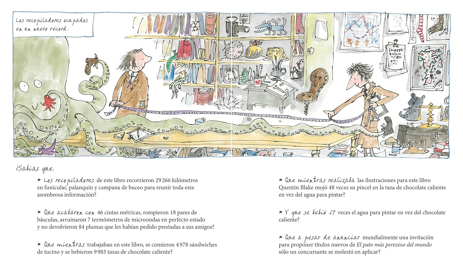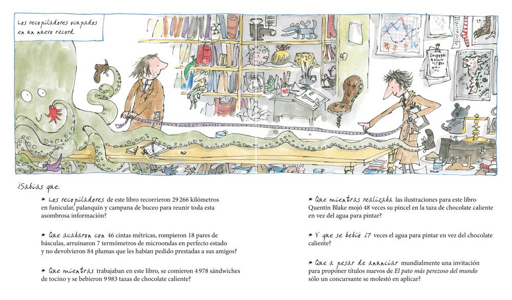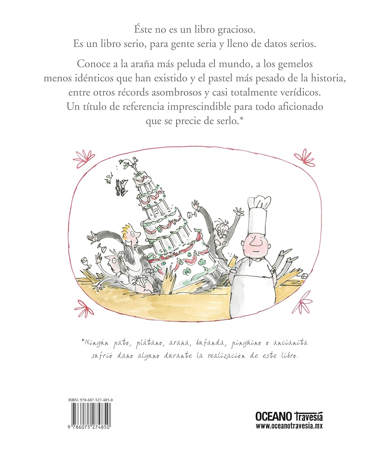 Un nuevo libro de Quentin Blake, uno de los más célebres ilustradores del mundo. Este libro está lleno de datos duros. Serios y duros. Cada uno de estos récords fue recolectado cuidadosamente por los autores, quienes definitivamente no se han inventado ninguno de ellos. Descubre, por ejemplo, cuál fue la altura del mayor salto hecho por una pulga con pata de madera, o quién tiene el récord de balancear más plátanos sobre su nariz. Las hazañas de los almanaques de Guinness se quedan cortas comparadas con las de este libro. Así que abre sus páginas y déjate sorprender por los hitos más sorprendentes de la historia.