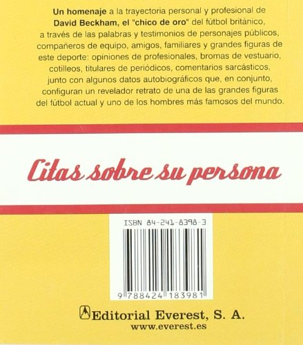 Este pequeño libro es un homenaje a la trayectoria personal y profesional de David Beckham a través de las palabras y testimonios de personajes públicos, compañeros de equipo, amigos y familiares y grandes figuras del mundo del fútbol. Una recopilación de citas de y sobre el chico de oro del fútbol británico. Opiniones a pie de campo, bromas de vestuario, cotilleos sobre Beckingham Palace, titulares de periódico, comentarios sarcásticos hechos en las gradas, opiniones del fútbol serio, junto con algunas de sus propias frases más inmortales, que en conjunto configuran un revelador retrato de uno de los grandes héroes del deporte y uno de los hombres más famosos del mundo hoy en día.