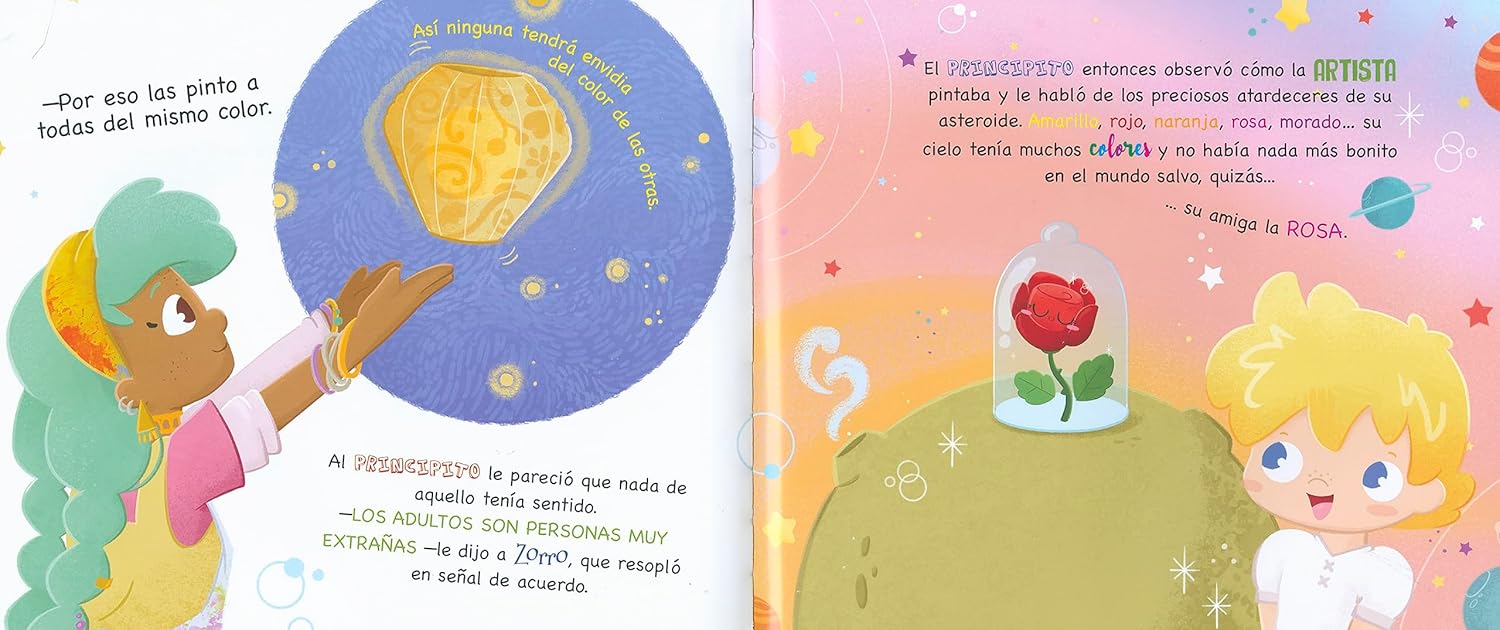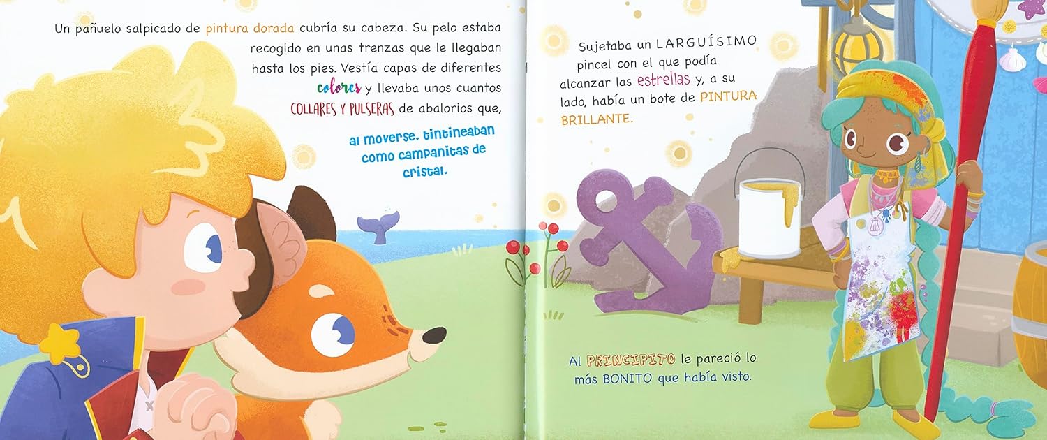 Miles de estrellas rodean el asteroide al que el Principito y el Zorro han llegado. Son de cientos de formas diferentes… pero todas del mismo color. Han sido creadas por una Artista que habita en el asteroide. ¿Por qué no tienen colores? ¿Qué puede hacer el Principito?