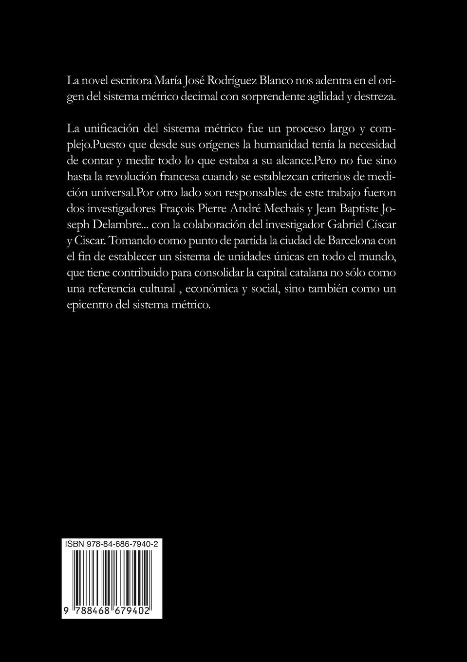 La novel escritora María José Rodríguez Blanco nos adentraen el origen del sistema métrico decimal con sorprendente agilidad y destreza. La unificación del sistema métrico fue un proceso largo ycomplejo.Puesto que desde sus orígenes la humanidad tenía la necesidad decontar y medir todo lo que estaba a su alcance.Pero no fue sino hasta larevolución francesa cuando se establezcan criterios de medición universal.Porotro lado son responsables de este trabajo fueron dos investigadores FraçoisPierre André Mechais y Jean Baptiste Joseph Delambre… con la colaboración delinvestigador Gabriel Císcar y Ciscar. Tomando como punto de partida la ciudadde Barcelona con el fin de establecer un sistema de unidades únicas en todo elmundo, que tiene contribuido para consolidar la capital catalana no sólo comouna referencia cultural , económica y social, sino también como un epicentrodel sistema métrico.