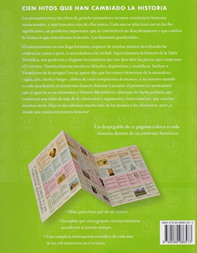 Cien hitos que han cambiado la historia. Los pensamientos y las obras de grandes pensadores siempre constituyen historias sensacionales, y aquí tenemos cien de ellas juntas. Cada una se relaciona con un hecho significativo, un problema importante que se convirtió en un descubrimiento y que cambió la forma en que entendemos el mundo. Los llamamos ponderables. El conocimiento no nos llega formado; requiere de muchas mentes descifrando las evidencias y paso a paso, ir acercándose a la verdad. Aquí relatamos la historia de la Tabla Periódica, una poderosa y elegante herramienta que nos descubre las piezas que componen el Universo. Nuestra historia involucra filósofos, alquimistas y científicos. Incluye a Demócrito de la antigua Grecia, quien dijo que los cuatro elementos de la naturaleza –agua, aire, tierra y fuego-, deben de estar compuestos de átomos; si no nuestro mundo es solo una ilusión; el aristócrata francés Antoine Lavoisier, el primero en mostrarnos que el agua no es un elemento; y Dimitri Mendeléyev, siberiano de barba poblada que construyó una tabla de más de 60 elementos y argumentó, correctamente, que existían muchos otros. Hoy en día sabemos mucho más de los átomos y los elementos, pero ¿a dónde nos conducirá nuestra historia?