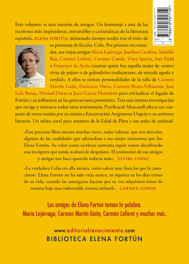 Este volumen es una reunión de amigos. Un homenaje a una de las escritoras más inspiradoras, entrañables y carismáticas de la literatura española, Elena Fortún, demasiado tiempo oculta tras el éxito de su personaje de ficción, Celia. Por primera vez reunidos, sus viejos amigos María Lejárraga, Josefina Carabias, Matilde Ras, Carmen Laforet, Carmen Conde, Viera Sparza, Inés Field o Francisco de Ayala cuentan quién fue aquella mujer de «rostro vivaz de pájaro o de golondrina trashumante, de mirada aguda y cordial». A ellos se suman personalidades de la talla de Carmen Martín Gaite, Francisco Nieva, Carmen Bravo-Villasante, José Luis Borau, Marisol Dorao o Juan García Hortelano para reivindicar el legado de Fortún y su influencia en las generaciones posteriores. Tras una intensa investigación que recoge y enmarca todos estos testimonios, Purificació Mascarell ofrece un conjunto de voces unidas por su estima a Encarnación Aragoneses Urquijo y su universo literario. Un relato coral para amantes de la Edad de Plata y sus redes de amistad. «Este precioso libro atesora muchas voces, todas valiosas, que nos desvelan algunas de las cualidades que adornaban a esa mujer misteriosa que fue Elena Fortún. Su valor como escritora aumenta según vamos descifrando una incógnita que jamás acabará de despejarse. El testimonio de sus amigos y amigas nos hace quererla todavía más». Elvira Lindo «La verdadera Celia era ella misma, como saben muy bien los que la conocieron. Elena Fortún no ha sido vieja nunca, ni siquiera en los días tristes de su vida, cuando las amarguras hacían que su voz adquiriera tonos de ternura bajo una imborrable sonrisa infantil». Carmen Conde Los amigos de Elena Fortún toman la palabra. María Lejárraga, Carmen Martín Gaite, Carmen Laforet y muchos más. Elena Fortún. Seudónimo de Encarnación Aragoneses (Madrid, 1886-1952). Creadora de las célebres novelas de Celia, el personaje infantil más emblemático de la literatura española, comenzó en 1928 a publicar en el suplemento infantil Gente Menuda las aventuras de esta niña madrileña que quería ser escritora. A través de sus vivencias y las de los otros protagonistas de la saga (Cuchifritín, Matonkikí, Patita y Mila) Elena Fortún construyó una fiel crónica de los años más convulsos del siglo XX español con la visión extraordinaria y fiel de unos personajes que, como su creadora, nunca terminaron de adaptarse al mundo moderno. Purificació Mascarell (Xàtiva, 1985) es profesora de Teoría de la Literatura, Literatura Comparada y Estudios Culturales en la Universitat de València. Investiga en torno al canon, la recepción literaria y los estudios feministas. Aparte de numerosos trabajos como filóloga, ha publicado la novela Mireia (2022, en castellano 2023), el libro de relatos Cartilla de redención (2021), el libro infantil Centre comercial l’Oblit (2018) y la obra de teatro Cavallers (2016). Ha coordinado los volúmenes Encerradas. Mujeres, escritura y reclusión (2022) y Escrito en la carne. Corporalidades literarias de mujer (2023), y ha editado a autores como Max Aub o Arthur Conan Doyle. Colabora habitualmente en las revistas Cuadernos Hispanoamericanos, Mercurio, Caràcters, Lletraferit y El món d’ahir. En la Biblioteca Elena Fortún de Renacimiento ha prologado Teatro para niños (2018) y ha editado Celia, novelista (2021).