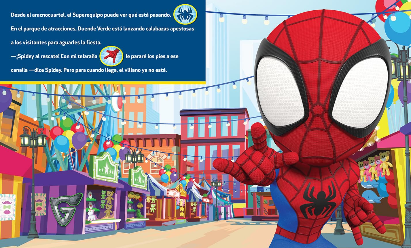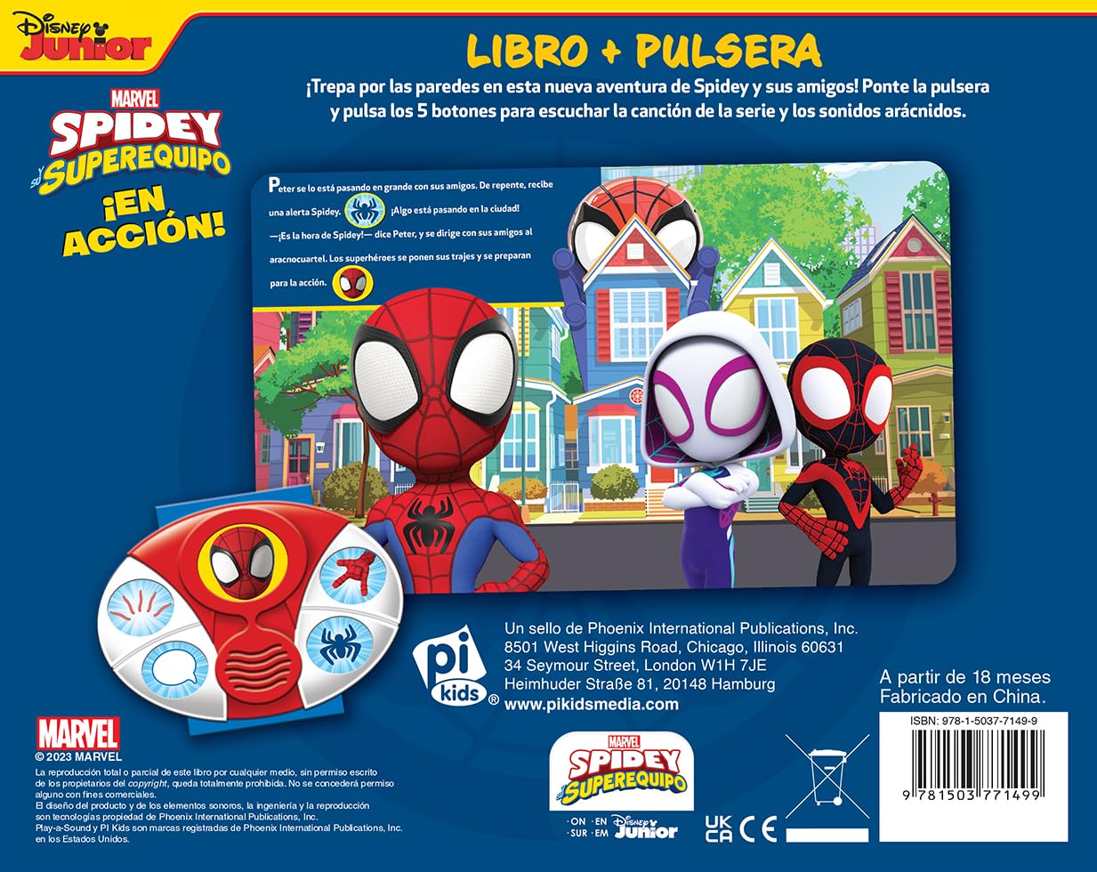 Trepa por las paredes en esta nueva aventura de Spidey y sus amigos Ponte la pulsera y pulsa los cinco botones para escuchar la canción de la serie y los sonidos arácnidos.