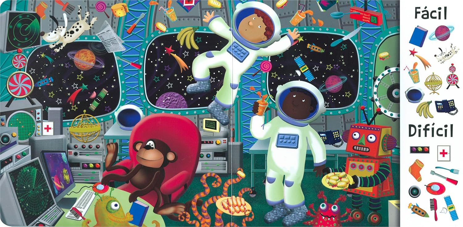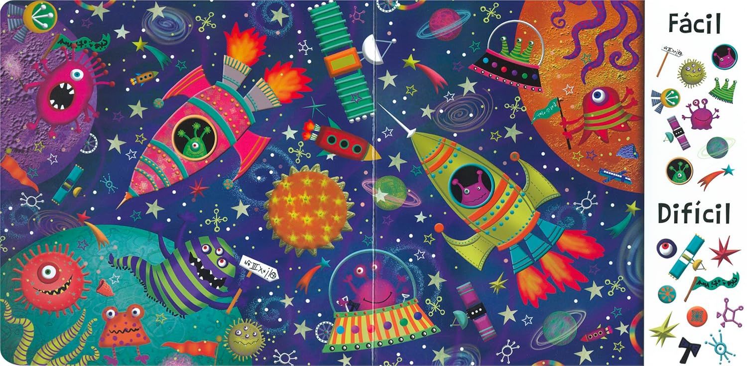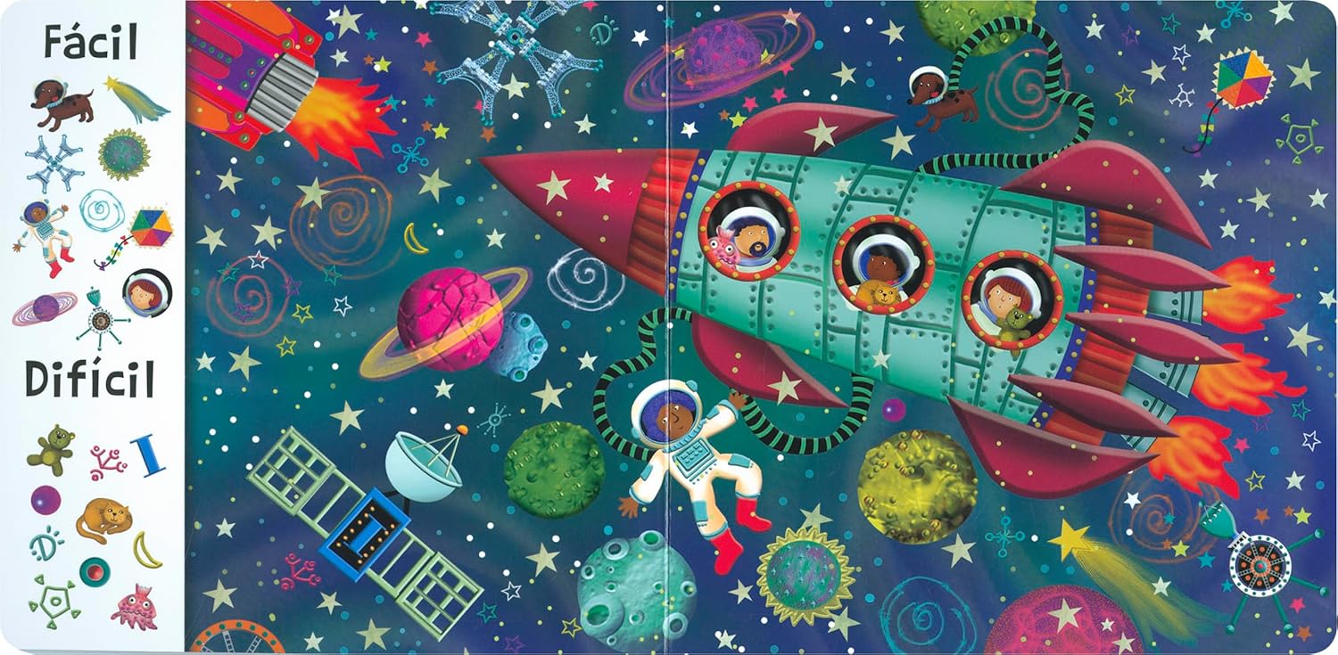 ¿Te apetece un paseo por el espacio? Te esperan planetas, estrellas, naves, astronautas, extraterrestres, y mucho más. Busca en las simpáticas escenas de este libro los objetos y personajes que te indican en cada página, unos más fáciles y otros menos fáciles, y diviértete durante horas.