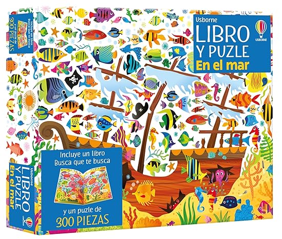 Una bonita caja-regalo que contiene un puzle de 300 piezas que representa la imagen de un barco hundido en el mar. La ilustración pertenece al libro Busca y Encuentra – En el fondo del mar, y está repleta de objetos que identificar y detalles que comentar. La caja también trae un libro de 24 páginas con más actividades de busca y encuentra de temática marina.