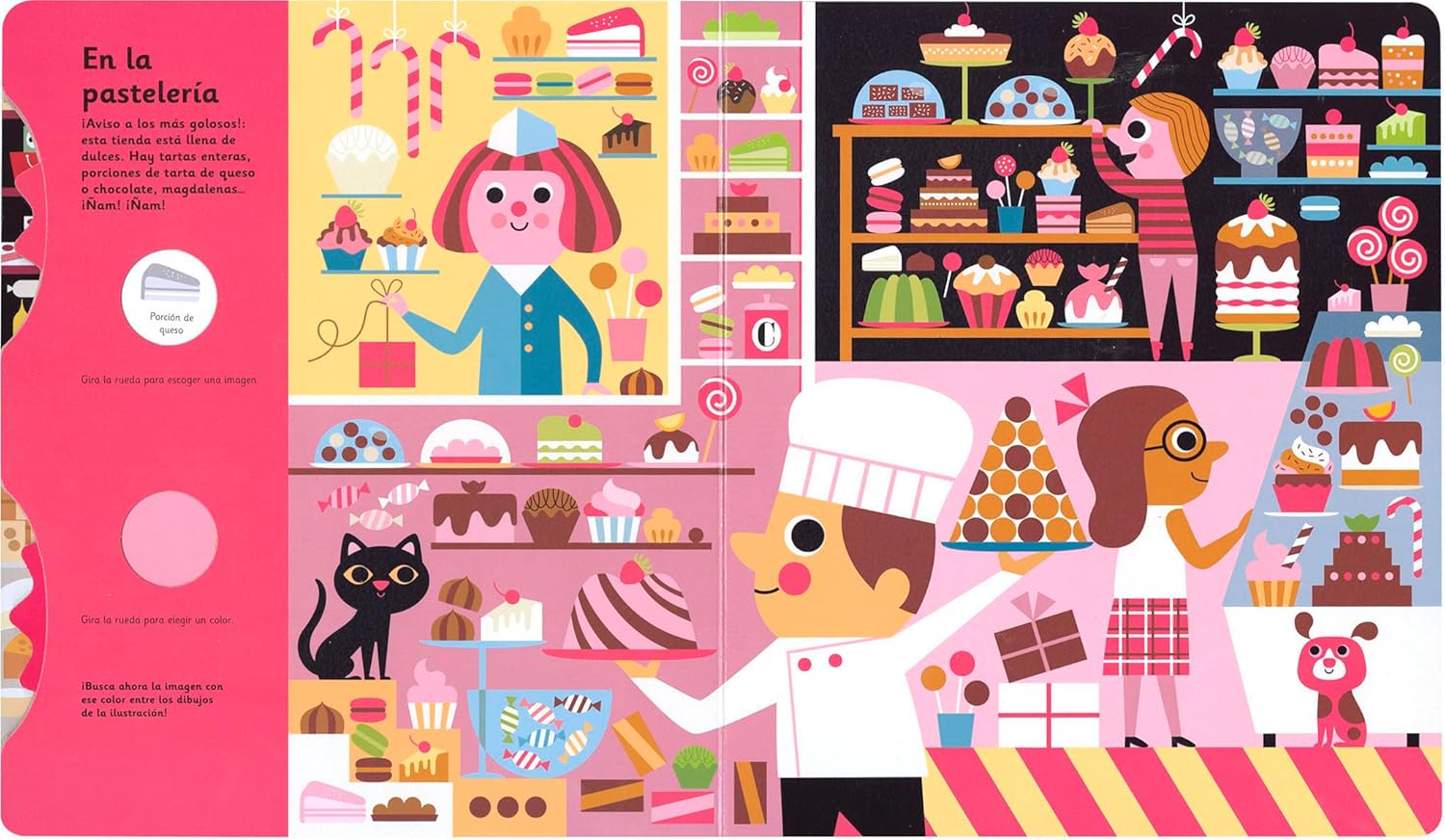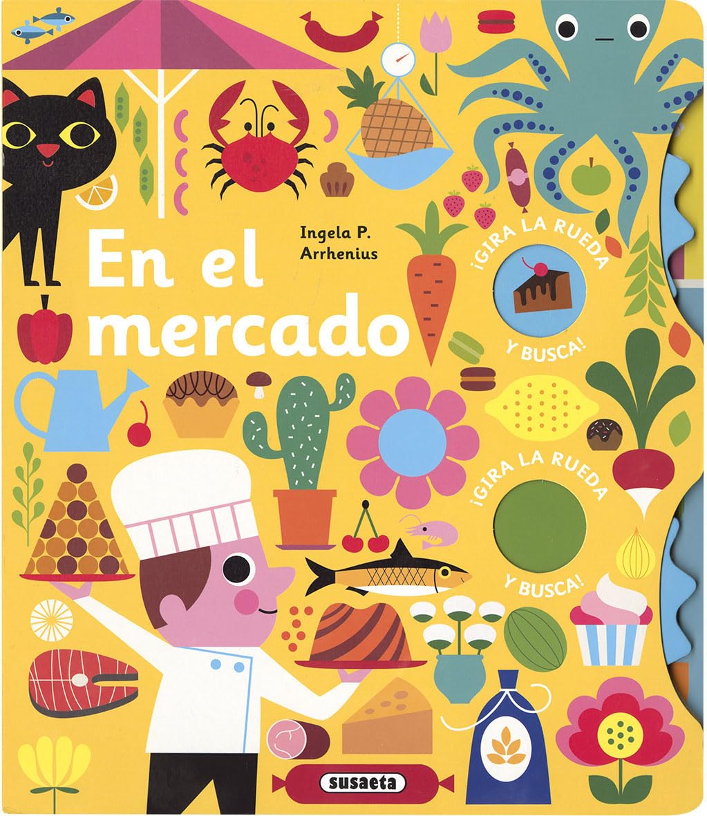 Gira las ruedas y encuentra lo que buscas entre los puestos del mercado con este libro pensado para desarrollar la agudeza visual y la concentración de los más pequeños.