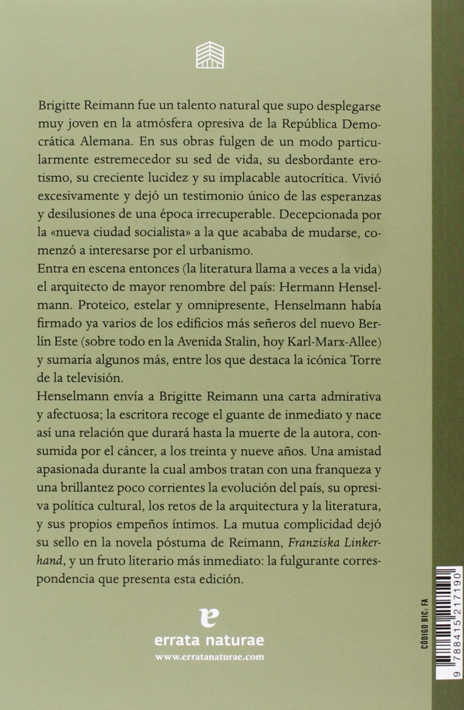 Brigitte Reimann fue un talento natural que supo desplegarse muy joven en la atmósfera opresiva de la República Democrática Alemana. En sus obras fulgen de un modo particularmente estremecedor su sed de vida, su desbordante erotismo, su creciente lucidez y su implacable autocrítica. Vivió excesivamente y dejó un testimonio único de las esperanzas y desilusiones de una época irrecuperable. Decepcionada por la «nueva ciudad socialista» a la que acababa de mudarse, comenzó a interesarse por el urbanismo. Entra en escena entonces (la literatura llama a veces a la vida) el arquitecto de mayor renombre del país: Hermann Henselmann. Proteico, estelar y omnipresente, Henselmann había firmado ya varios de los edificios más señeros del nuevo Berlín Este (sobre todo en la Avenida Stalin, hoy Karl-Marx-Allee) y sumaría algunos más, entre los que destaca la icónica Torre de la televisión. Henselmann envía a Brigitte Reimann una carta admirativa y afectuosa; la escritora recoge el guante de inmediato y nace así una relación que durará hasta la muerte de la autora, consumida por el cáncer, a los treinta y nueve años. Una amistad apasionada durante la cual ambos tratan con una franqueza y una brillantez poco corrientes la evolución del país, su opresiva política cultural, los retos de la arquitectura y la literatura, y sus propios empeños íntimos. La mutua complicidad dejó su sello en la novela póstuma de Reimann, Franziska Linkerhand, y un fruto literario más inmediato: la fulgurante correspondencia que presenta esta edición.