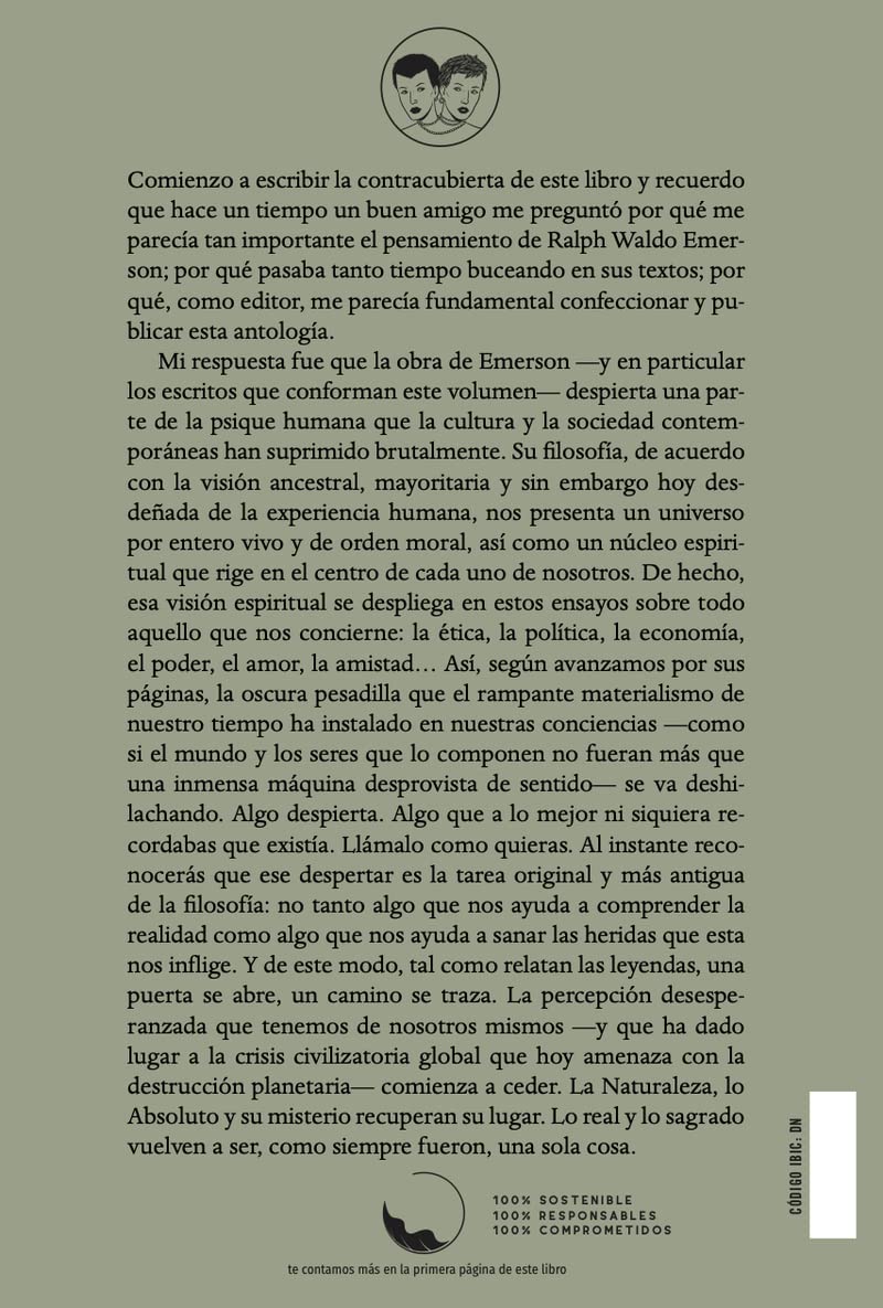 Comienzo a escribir la contracubierta de este libro y recuerdo que hace un tiempo un buen amigo me preguntó por qué me parecía tan importante el pensamiento de Ralph Waldo Emerson; por qué pasaba tanto tiempo buceando en sus textos; por qué, como editor, me parecía fundamental confeccionar y publicar esta antología. Mi respuesta fue que la obra de Emerson ―y en particular los escritos que conforman este volumen― despierta una parte de la psique humana que la cultura y la sociedad contemporáneas han suprimido brutalmente. Su filosofía, de acuerdo con la visión ancestral, mayoritaria y sin embargo hoy desdeñada de la experiencia humana, nos presenta un universo por entero vivo y de orden moral, así como un núcleo espiritual que rige en el centro de cada uno de nosotros. De hecho, esa visión espiritual se despliega en estos ensayos sobre todo aquello que nos concierne: la ética, la política, la economía, el poder, el amor, la amistad… Así, según avanzamos por sus páginas, la oscura pesadilla que el rampante materialismo de nuestro tiempo ha instalado en nuestras conciencias ―como si el mundo y los seres que lo componen no fueran más que una inmensa máquina desprovista de sentido― se va deshilachando. Algo despierta. Algo que a lo mejor ni siquiera recordabas que existía. Llámalo como quieras. Al instante reconocerás que ese despertar es la tarea original y más antigua de la filosofía: no tanto algo que nos ayuda a comprender la realidad como algo que nos ayuda a sanar las heridas que esta nos inflige. Y de este modo, tal como relatan las leyendas, una puerta se abre, un camino se traza. La percepción desesperanzada que tenemos de nosotros mismos ―y que ha dado lugar a la crisis civilizatoria global que hoy amenaza con la destrucción planetaria― comienza a ceder. La Naturaleza, lo Absoluto y su misterio recuperan su lugar. Lo real y lo sagrado vuelven a ser, como siempre fueron, una sola cosa.