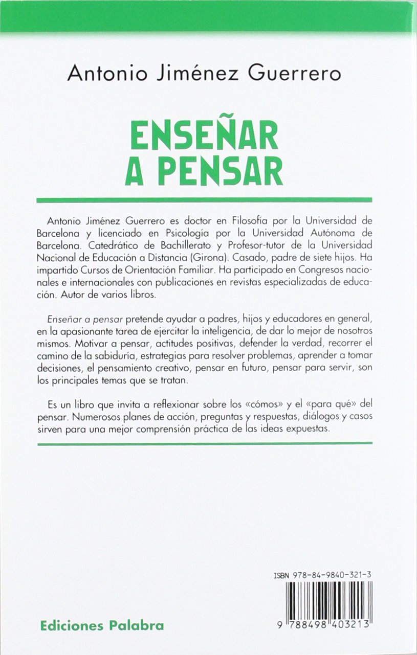 Esta obra está concebida para ayudar a padres, hijos y educadores en general en la apasionante tarea de ejercitar la inteligencia, de dar lo mejor de nosotros mismos. Enseñar a pensar pretende ayudar a padres, hijos y educadores en general, en la apasionante tarea de ejercitar la inteligencia, de dar lo mejor de nosotros mismos. Motivar a pensar, actitudes positivas, defender la verdad, recorrer el camino de la sabiduría, estrategias para resolver problemas, aprender a tomar decisiones, el pensamiento creativo, pensar en futuro, pensar para servir, son los principales temas que se tratan. Es un libro que invita a reflexionar sobre los “cómos” y el “para qué” del pensar. Numerosos planes de acción, preguntas y respuestas, diálogos y casos sirven para una mejor comprensión práctica de las ideas expuestas. Antonio Jiménez Guerrero es doctor en Filosofía por la Universidad de Barcelona y licenciado en Psicología por la Universidad Autónoma de Barcelona. Catedrático de Bachillerato y Profesor-tutor de la Universidad Nacional de Educación a Distancia (Girona). Casado, padre de siete hijos. Ha impartido Cursos de Orientación Familiar. Ha participado en Congresos nacionales e internacionales con publicaciones en revistas especializadas de educación. Autor de varios libros.