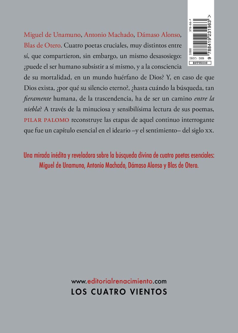 Miguel de Unamuno, Antonio Machado, Dámaso Alonso, Blas de Otero. Cuatro poetas cruciales, muy distintos entre sí, que compartieron, sin embargo, un mismo desasosiego: ¿puede el ser humano subsistir a sí mismo, y a la consciencia de su mortalidad, en un mundo huérfano de Dios? Y, en caso de que Dios exista, ¿por qué su silencio eterno?, ¿hasta cuándo la búsqueda, tan fieramente humana, de la trascendencia, ha de ser un camino entre la niebla? A través de la minuciosa y sensibilísima lectura de sus poemas, Pilar Palomo reconstruye las etapas de aquel continuo interrogante que fue un capítulo esencial en el ideario –y el sentimiento– del siglo XX. Una mirada inédita y reveladora sobre cuatro poetas esenciales: Miguel de Unamuno, Antonio Machado, Dámaso Alonso y Blas de Otero. Pilar Palomo (Madrid, 1933) ganó la cátedra de Literatura Española en sus relaciones con la Universal con tan solo treinta y cuatro años, siendo la primera mujer en España en acceder a una cátedra en dicha especialidad. Tras impartir clases en las universidades de Madrid (UCM), La Laguna, Zaragoza y Málaga, regresa a Madrid, a la Facultad de Ciencias de la Información, en 1978. En la actualidad, es catedrática emérita de dicha institución, en la que se ha creado, asimismo, un Seminario de Investigación Pilar Palomo. Especialista en literatura de los siglos de oro –sus estudios sobre Tirso de Molina son aún referencia obligada–, en la obra de Bécquer y en la poesía española contemporánea, ha sido pionera en los estudios sobre la relación entre literatura y periodismo y, en las últimas décadas, ha dirigido su atención hacia la obra de Carmen de Burgos, Colombine, y el periodismo feminista en la España del XX. Casada con el novelista, catedrático y editor Antonio Prieto, fue su estrecha colaboradora en la inicial labor editorial de este último.