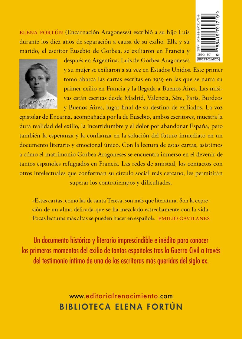 Elena Fortún (Encarnación Aragoneses) escribió a su hijo Luis durante los diez años de separación a causa de su exilio. Ella y su marido, el escritor Eusebio de Gorbea, se exiliaron en Francia y después en Argentina. Luis de Gorbea Aragoneses y su mujer, Ana María Hug, se exiliaron a su vez en Estados Unidos. Ese primer tomo abarca las cartas escritas en 1939 en las que se narra su primer exilio en Francia y la llegada a Buenos Aires. Las misivas están escritas desde Madrid, Valencia, Sète, París, Burdeos y Buenos Aires, lugar final de su destino de exiliados. La voz epistolar de Encarna, acompañada por la de Eusebio, ambos escritores, muestra la dura realidad del exilio, la incertidumbre y el dolor por abandonar España, pero también la esperanza y la confianza en la solución del futuro inmediato en un documento literario y emocional único. Con la lectura de estas cartas, asistimos a cómo el matrimonio Gorbea Aragoneses se encuentra inmerso en el devenir de tantos españoles refugiados en Francia. Las redes de amistad, los contactos con otros intelectuales que conforman su círculo social más cercano, les permitirán superar los contratiempos y dificultades. Este epistolario se conserva en el Archivo personal de Elena Fortún que forma parte del Archivo Borau de la Biblioteca de la Real Academia Española. «Estas cartas, como las de santa Teresa, son más que literatura. Son la expresión de un alma delicada que se ha mezclado estrechamente con la vida. Pocas lecturas más altas se pueden hacer en español». Emilio Gavilanes Un documento histórico y literario imprescindible e inédito para conocer los primeros momentos del exilio de tantos españoles tras la Guerra Civil a través del testimonio íntimo de una de las escritoras más queridas del siglo XX. Elena Fortún (Madrid, 1886-1952). Creadora de las célebres novelas de Celia, el personaje infantil más emblemático de la literatura española, comenzó en 1928 a publicar las aventuras de esta niña madrileña que quería ser escritora en el suplemento infantil Gente Menuda. A través de sus vivencias y las de los otros protagonistas de la saga (Cuchifritín, Matonkikí, Patita y Mila) Elena Fortún construyó una fiel crónica de los años más convulsos del siglo xx español con la visión extraordinaria y fiel de unos personajes que, como su creadora, nunca terminaron de adaptarse al mundo moderno. Inmaculada Carretero es doctora en Filología Hispánica por la Universidad Autónoma de Madrid. Ha trabajado como lexicógrafa en la Real Academia Española y como profesora de instituto. En la actualidad es colaboradora del Diccionario Histórico de la Lengua Española de la RAE. Su investigación se centra en la obra de Elena Fortún y su epistolario familiar. En Renacimiento ha editado Celia en la revolución junto a María Jesús Fraga, codirectora de la colección Biblioteca Elena Fortún.