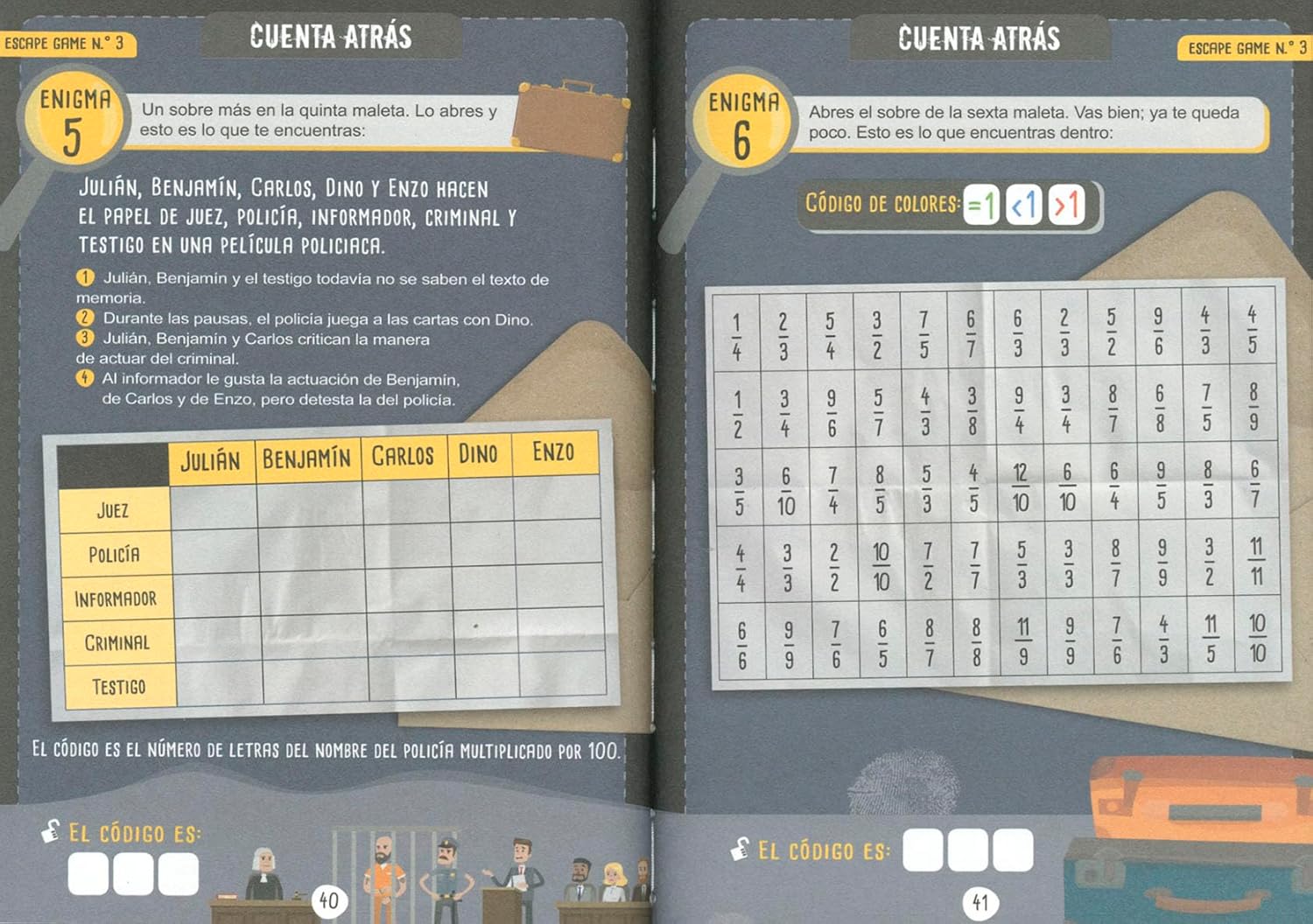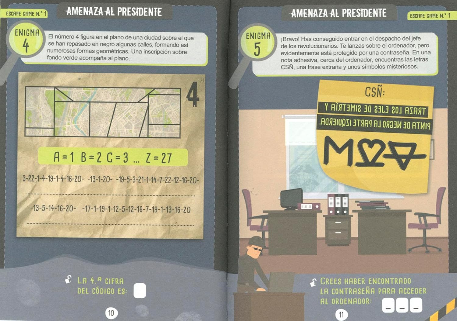 ¿Eres capaz de resolver todos los enigmas antes de que acabe el tiempo? Completa tu formación como agente, rescata a un ministro de las garras de un “paparazzi” o recupera unas fotos prohibidas para evitar un incidente diplomático. ¡Combina pistas ocultas, descifra códigos encriptados y cumple tu misión como agente secreto! ¡Y de paso, aprovecha para revisar y poner a prueba tus conocimientos matemáticos! “Escape Games” es un apasionante volumen con 5 juegos de evasión y otros 5 pequeños desafíos para que tu cerebro no pare nunca.
