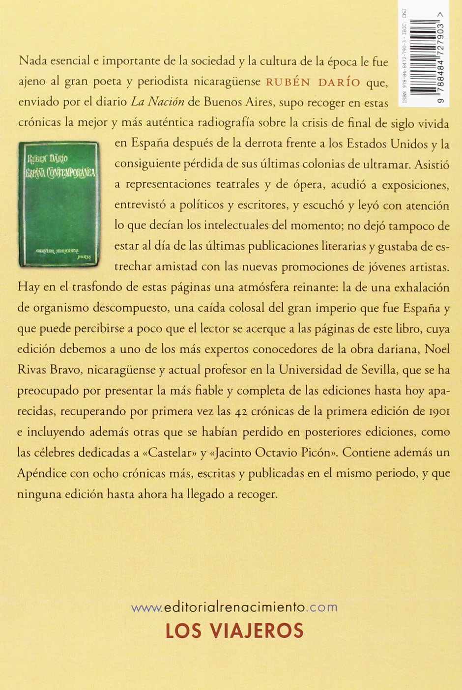Nada esencial e importante de la sociedad y la cultura de la época le fue ajeno al gran poeta y periodista nicaragüense Rubén Darío que, enviado por el diario La Nación de Buenos Aires, supo recoger en estas crónicas la mejor y más auténtica radiografía sobre la crisis de final de siglo vivida en España después de la derrota frente a los Estados Unidos y la consiguiente pérdida de sus últimas colonias de ultramar. Asistió a representaciones teatrales y de ópera, acudió a exposiciones, entrevistó a políticos y escritores, y escuchó y leyó con atención lo que decían los intelectuales del momento; no dejó tampoco de estar al día de las últimas publicaciones literarias y gustaba de estrechar amistad con las nuevas promociones de jóvenes artistas. Hay en el trasfondo de estas páginas una atmósfera reinante: la de una exhalación de organismo descompuesto, una caída colosal del gran imperio que fue España y que puede percibirse a poco que el lector se acerque a las páginas de este libro, cuya edición debemos a uno de los más expertos conocedores de la obra dariana, Noel Rivas Bravo, nicaragüense y actual profesor en la Universidad de Sevilla, que se ha preocupado por presentar la más fiable y completa de las ediciones hasta hoy aparecidas, recuperando por primera vez las 42 crónicas de la primera edición de 1901 e incluyendo además otras que se habían perdido en posteriores ediciones, como las célebres dedicadas a Castelar y Jacinto Octavio Picón. Contiene además un Apéndice con ocho crónicas más, escritas y publicadas en el mismo periodo, y que ninguna edición hasta ahora ha llegado a recoger. Rubén Darío (Metapa, hoy Ciudad Darío, Matagalpa, 1867-León, Nicaragua, 1916) fue un viajero incansable, un poeta peregrino. De genio precoz, durante toda su vida fue también redactor, fundador y director de diarios y revistas, aunque su grandiosidad de poeta ha opacado esta faceta importante de su escritura. Sin duda, podemos afirmar que en su tiempo no existe publicación periódica en lengua española, de verdadera o relativa importancia, en donde no haya aparecido su nombre ocupando un lugar de excepción. No en balde con él y su ejemplo se inicia en América Latina un nuevo modo de entender la vocación del escritor, la de una entrega total y sin contemplaciones a la propia obra. De sus libros que recogen las crónicas de sus viajes, destacamos Peregrinaciones (1901), La caravana pasa (1902), El viaje a Nicaragua e Intermezzo tropical (1909), España contemporánea (1901) y Tierras solares (1904). Estos dos últimos libros vienen a recoger las impresiones, experiencias e ideas que Darío tuvo sobre la España de entresiglos, y que han merecido notables estudios y comentarios de lectores y especialistas darianos.