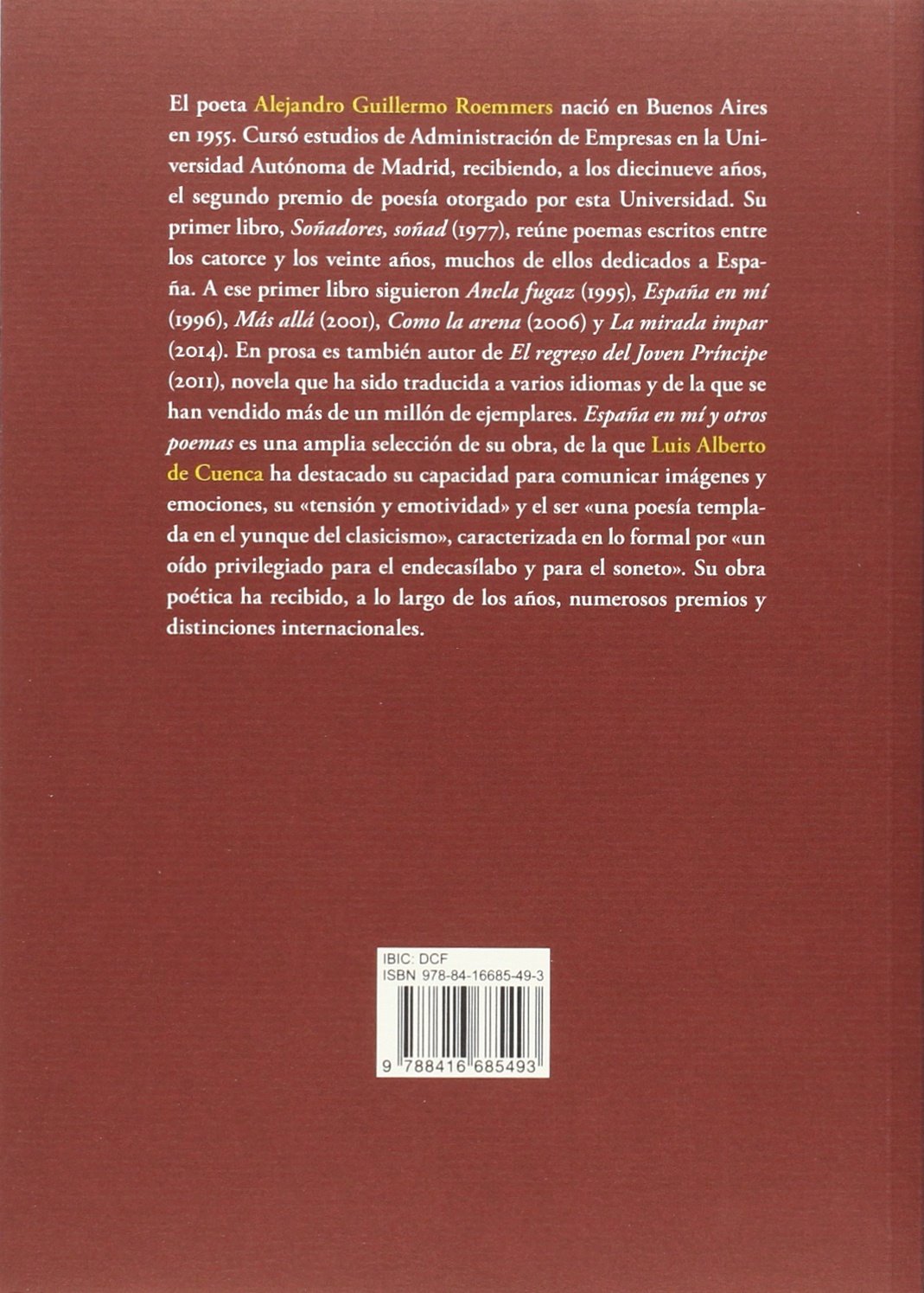 El poeta Alejandro Guillermo Roemmers nació en Buenos Aires en 1955. Cursó estudios de Administración de Empresas en la Universidad Autónoma de Madrid, recibiendo, a los diecinueve años, el segundo premio de poesía otorgado por esta Universidad. Su primer libro, Soñadores, soñad (1977), reúne poemas escritos entre los catorce y los veinte años, muchos de ellos dedicados a España. A ese primer libro siguieron Ancla fugaz (1995), España en mí (1996), Más allá (2001), Como la arena (2006) y La mirada impar (2014). En prosa es también autor de El regreso del Joven Príncipe (2011), novela que ha sido traducida a varios idiomas y de la que se han vendido más de un millón de ejemplares. España en mí y otros poemas es una amplia selección de su obra, de la que Luis Alberto de Cuenca ha destacado su capacidad para comunicar imágenes y emociones, su «tensión y emotividad» y el ser «una poesía templada en el yunque del clasicismo», caracterizada en lo formal por «un oído privilegiado para el endecasílabo y para el soneto». Su obra poética ha recibido, a lo largo de los años, numerosos premios y distinciones internacionales.