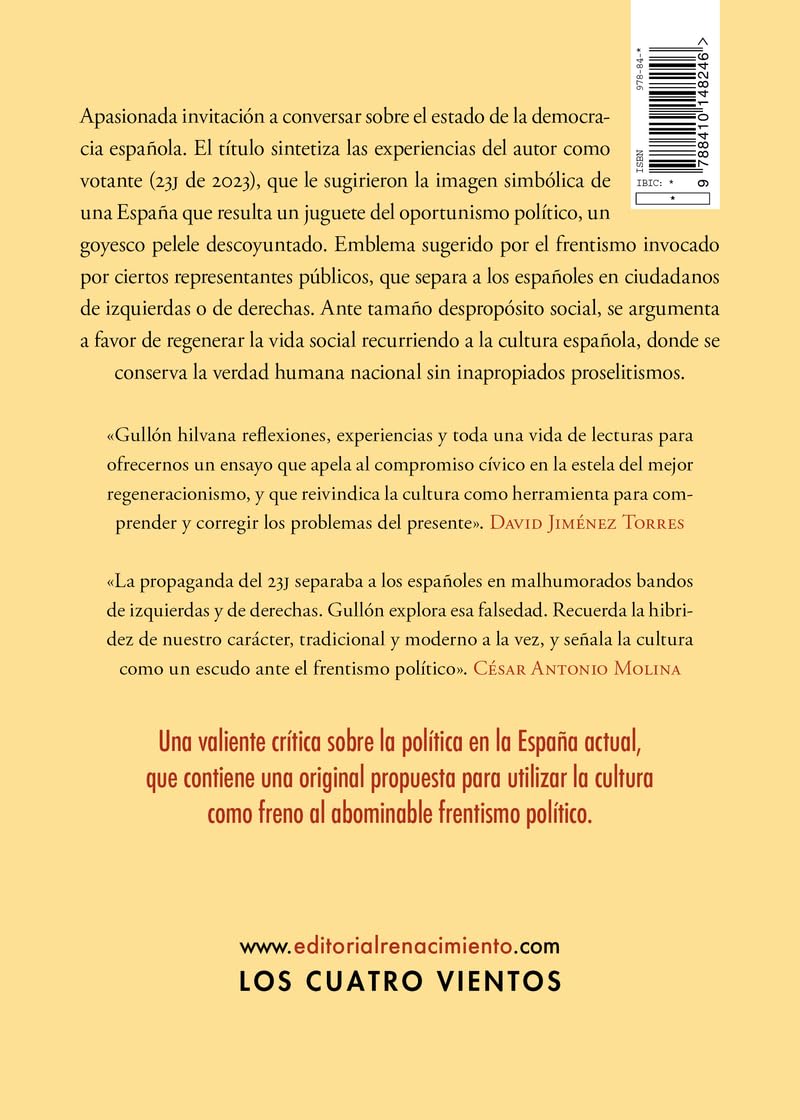 Apasionada invitación a conversar sobre el estado de la democracia española. El título sintetiza las experiencias del autor como votante (23j de 2023), que le sugirieron la imagen simbólica de una España que resulta un juguete del oportunismo político, un goyesco pelele descoyuntado. Emblema sugerido por el frentismo invocado por ciertos representantes públicos, que separa a los españoles en ciudadanos de izquierdas o de derechas. Ante tamaño despropósito social, se argumenta a favor de regenerar la vida social recurriendo a la cultura española, donde se conserva la verdad humana nacional sin inapropiados proselitismos. «Gullón hilvana reflexiones, experiencias y toda una vida de lecturas para ofrecernos un ensayo que apela al compromiso cívico en la estela del mejor regeneracionismo, y que reivindica la cultura como herramienta para comprender y corregir los problemas del presente». David Jiménez Torres «La propaganda del 23j separaba a los españoles en malhumorados bandos de izquierdas y de derechas. Gullón explora esa falsedad. Recuerda la hibridez de nuestro carácter, tradicional y moderno a la vez, y señala la cultura como un escudo ante el frentismo político». César Antonio Molina Una valiente crítica sobre la política en la España actual, que contiene una original propuesta para utilizar la cultura como freno al abominable frentismo político. Germán Gullón (Santander, 1945), escritor y crítico literario, ha dedicado su carrera de profesor universitario a defender la integridad de la cultura literaria española. Entre sus treinta títulos se encuentran el innovador Los mercaderes en el templo de la literatura (2004), la mejor biografía del escritor canario, Benito Pérez Galdós, maestro de las letras modernas (2020), galardonada con el Premio de las Letras Ciudad de Santander, 2020, y la reivindicación imprescindible de la obra de la escritora gallega, Emilia Pardo Bazán o el tiempo de la mujer (2021).