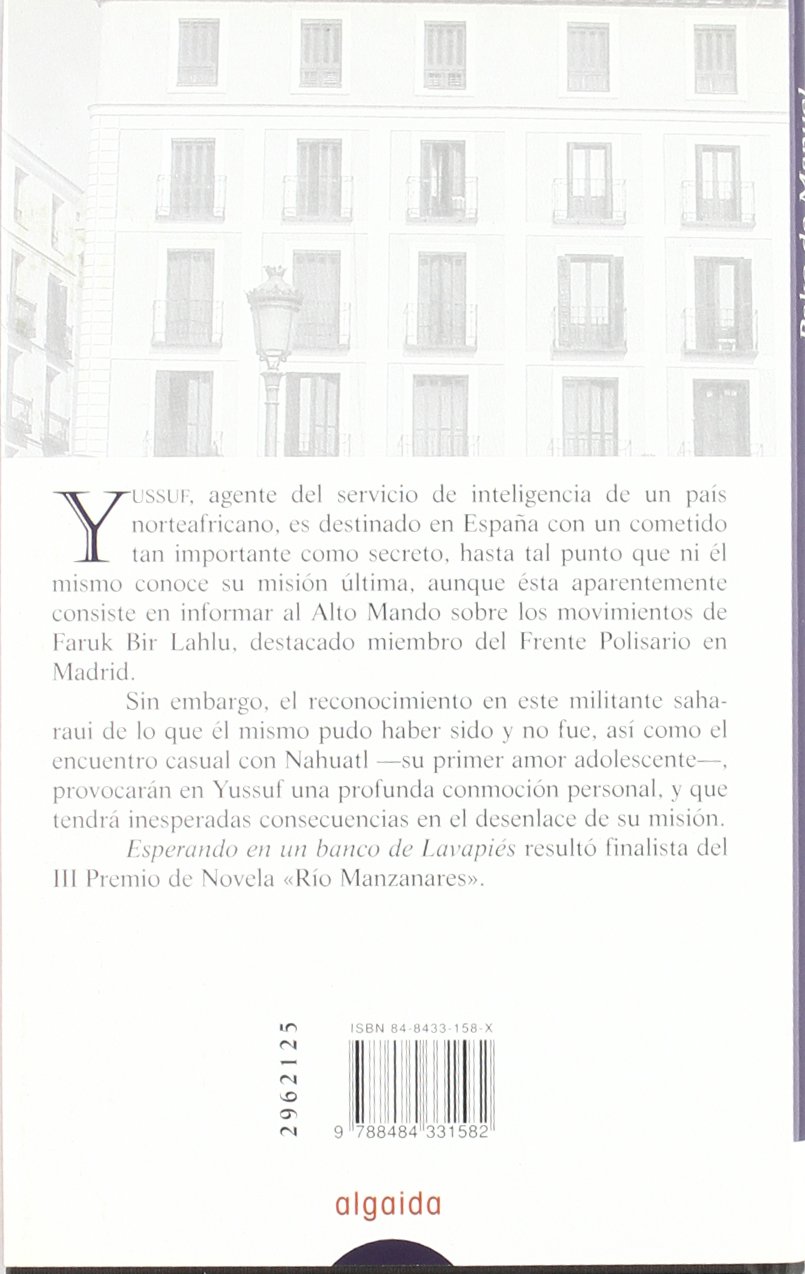 Yussuf, agente del servicio de inteligencia de un país norteafricano, es destinado en España con un cometido tan importante como secreto, hasta tal punto que ni él mismo conoce su misión última, aunque ésta aparentemente consiste en informar al Alto Mando sobre los movimientos de Faruk Bir Lahlu, destacado miembro del Frente Polisario en Madrid. Sin embargo, el reconocimiento en este militante saharaui de lo que él mismo pudo haber sido y no fue, así como el encuentro casual con Nahuatl su primer amor adolescente, provocarán en Yussuf una profunda conmoción personal, y que tendrá inesperadas consecuencias en el desenlace de su misión. “Esperando en un banco de Lavapiés” resultó finalista del III Premio de Novela «Río Manzanares