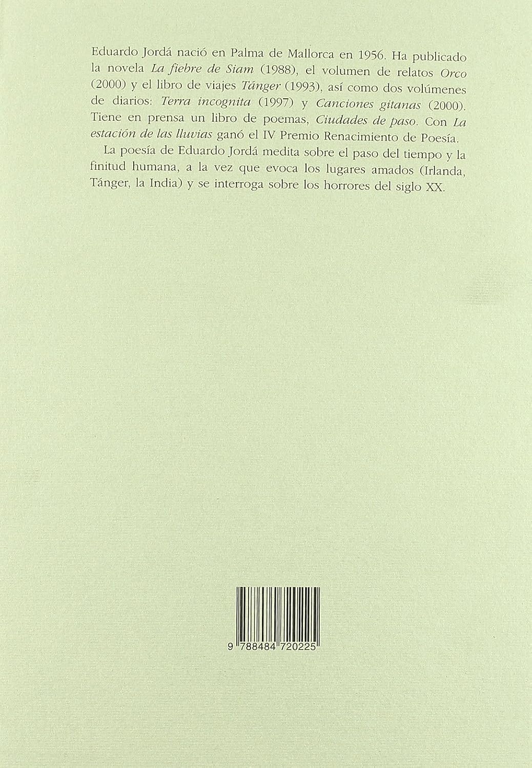Eduardo Jordá nació en Palma de Mallorca en 1956. Ha publicado la novela La fiebre de Siam (1988), el volumen de relatos Orco (2000) y el libro de viajes Tánger (1993), así como dos volúmenes de diarios: Terra incognita (1997) y Canciones gitanas (2000). Tiene en prensa un libro de poemas, Ciudades de paso. Con La estación de las lluvias ganó el IV Premio Renacimiento de Poesía. La poesía de Eduardo Jordá medita sobre el paso del tiempo y la finitud humana, a la vez que evoca los lugares amados (Irlanda, Tánger, la India) y se interroga sobre los horrores del siglo XX.