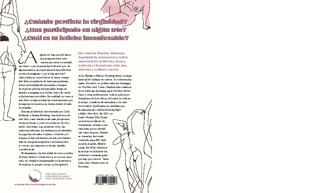 ¿Alguna vez has querido hacer una pregunta sobre sexo ―ya sea por mera curiosidad, por deseo o por la sospecha furtiva de que, de alguna manera, la respuesta será muy diferente a como la imaginas― y no te has atrevido? ¡«Every Body» se convertirá en tu mejor compañía! Esta recopilación de historias anónimas, textos profundamente personales y ensayos de expertos aborda innumerables temas sin atender a estigmas ni a clichés; todo ello unido a ilustraciones increíbles. En realidad, es como si este libro recogiera todas las conversaciones que la mayoría de nosotros no hemos tenido el valor de entablar. Gracias al talentoso dúo formado por Julia Rothman y Shaina Feinberg, tras la lectura de este libro, esas charlas serán más perspicaces, enriquecedoras y, como no podía ser de otro modo, divertidas. Las primeras veces, las relaciones abiertas, los embarazos accidentales, los juguetes sexuales, el placer, el miedo y el trauma, el descubrimiento sexual y muchísimo más en una guía acogedora e inclusiva sobre tu cuerpo, sin importar su forma, tamaño o preferencias. El dinamismo y la diversidad de voces y estilos de «Every Body» lo convierten en un recurso esencial y un cómplice indispensable en la aventura de explorar tu propio cuerpo (¡y los ajenos!).
