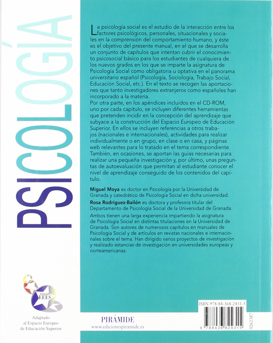 La psicología social es el estudio de la interacción entre los factores psicológicos, personales, situacionales y sociales en la comprensión del comportamiento humano, y éste es el objetivo del presente manual, en el que se desarrolla un conjunto de capítulos que intentan cubrir el conocimiento psicosocial básico para los estudiantes de cualquiera de los nuevos grados en los que se imparte la asignatura de Psicología Social como obligatoria u optativa en el panorama universitario español (Psicología, Sociología, Trabajo Social, Educación Social, etc.). En el texto se recogen las aportaciones que tanto investigadores extranjeros como españoles han incorporado a la materia. Por otra parte, en los apéndices incluidos en el CD-ROM, uno por cada capítulo, se incluyen diferentes herramientas que pretenden incidir en la concepción del aprendizaje que subyace a la construcción del Espacio Europeo de Educación Superior. En ellos se incluyen referencias a otros trabajos (nacionales e internacionales), actividades para realizar individualmente o en grupo, en clase o en casa, y páginas web relevantes para lo tratado en el tema correspondiente. También, en ocasiones, se aportan las guías necesarias para realizar una pequeña investigación y, por último, unas preguntas de autoevaluación que permitan al estudiante conocer el nivel de aprendizaje conseguido de los contenidos del capítulo.