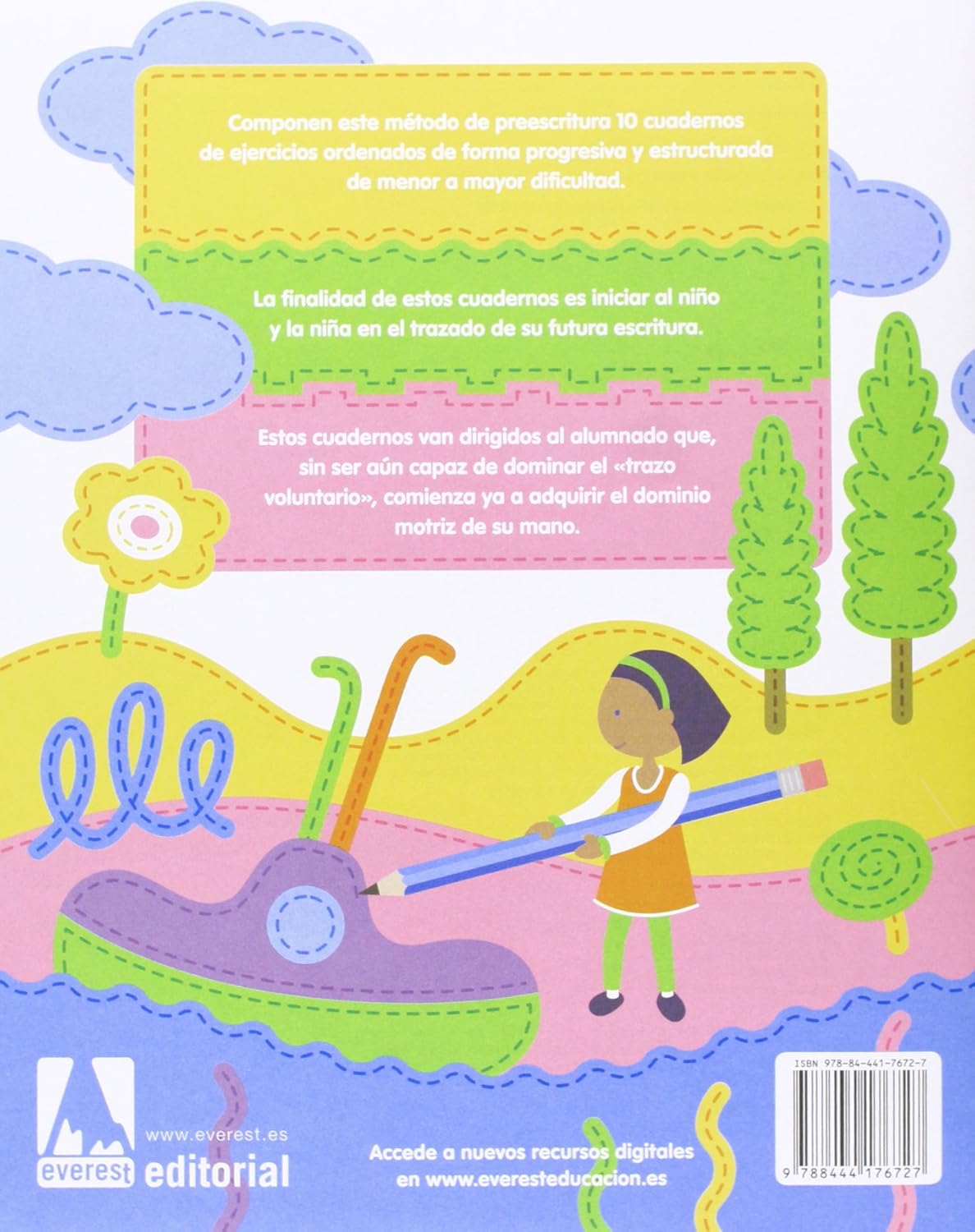 Componen este método de preescritura 10 cuadernos de ejercicios ordenados de forma progresiva y estructurada de menor a mayor dificultad. Su finalidad es la de iniciar al niño en el desarrollo de las habilidades motrices finas que necesitará en el futuro para la escritura. Es un método analítico, que se basa en la repetición por separado de los movimientos de la mano, hasta llegar a conseguir una habilidad motora que permita después trazar todas las letras. En ese título de la colección se trabaja las grafías de todas las letras.
