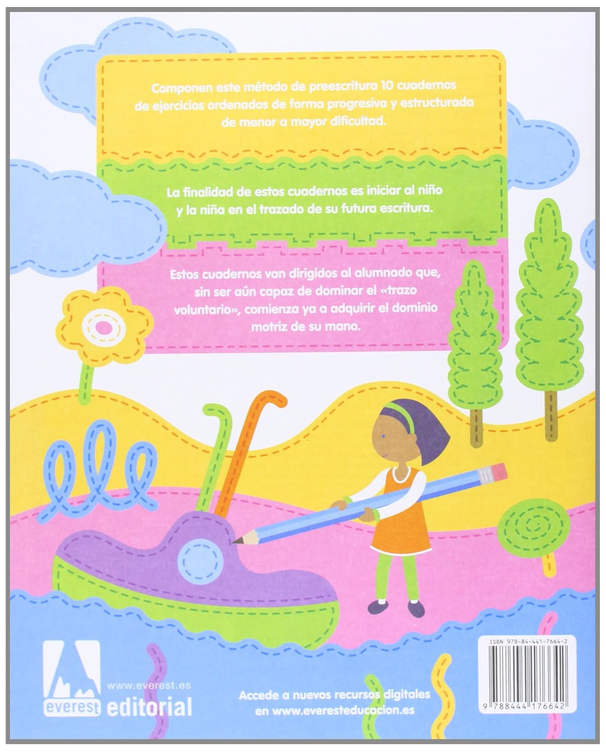 Componen este método de preescritura 10 cuadernos de ejercicios ordenados de forma progresiva y estructurada de menor a mayor dificultad. Su finalidad es la de iniciar al niño en el desarrollo de las habilidades motrices finas que necesitará en el futuro para la escritura. Es un método analítico, que se basa en la repetición por separado de los movimientos de la mano, hasta llegar a conseguir una habilidad motora que permita después trazar, todas las letras. En ese título de la colección se trabajan combinaciones de trazos verticales, horizontales y oblicuos.