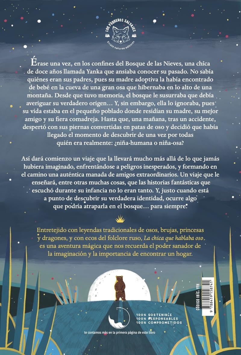 Érase una vez, en los confines del Bosque de las Nieves, una chica de doce años llamada Yanka que ansiaba conocer su pasado. No sabía quiénes eran sus padres, pues su madre adoptiva la había encontrado de bebé en la cueva de una gran osa que hibernaba en lo alto de una montaña. Desde que tuvo memoria, el bosque le susurraba que debía averiguar su verdadero origen… Y, sin embargo, ella lo ignoraba, pues su vida estaba en el pequeño poblado donde residían su madre, su mejor amigo y su fiera comadreja. Hasta que, una mañana, tras un accidente, despertó con sus piernas convertidas en patas de oso y decidió que había llegado el momento de descubrir de una vez por todas quién era realmente: ¿niña-humana o niña-osa? Así dará comienzo un viaje que la llevará mucho más allá de lo que jamás hubiera imaginado, enfrentándose a peligros inesperados, y formando en el camino una auténtica manada de amigos extraordinarios. Un viaje que le enseñará, entre otras muchas cosas, que las historias fantásticas que escuchó durante su infancia no lo eran tanto. Y, justo cuando está a punto de descubrir su verdadera identidad, ocurre algo que podría atraparla en el bosque… para siempre