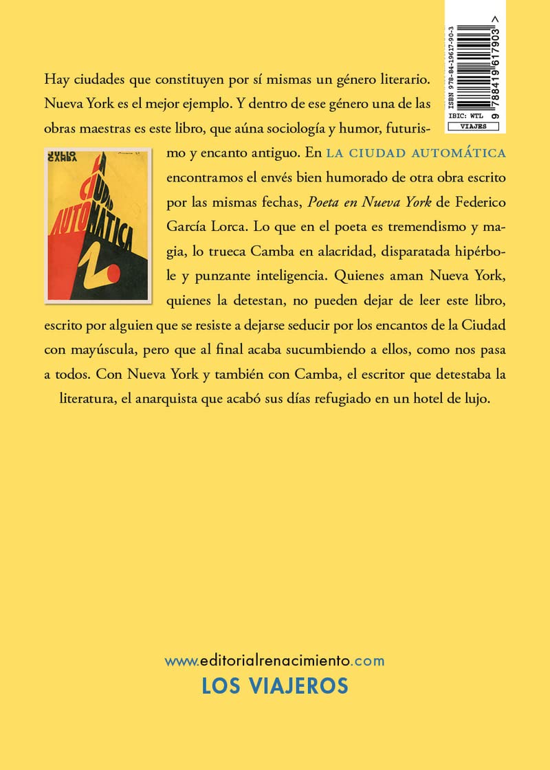 Hay ciudades que constituyen por sí mismas un género literario. Nueva York es el mejor ejemplo. Y dentro de ese género una de las obras maestras es este libro, que aúna sociología y humor, futurismo y encanto antiguo. En La ciudad automática encontramos el envés bien humorado de otra obra escrito por las mismas fechas, Poeta en Nueva York de Federico García Lorca. Lo que en el poeta es tremendismo y magia, lo trueca Camba en alacridad, disparatada hipérbole y punzante inteligencia. Quienes aman Nueva York, quienes la detestan, no pueden dejar de leer este libro, escrito por alguien que se resiste a dejarse seducir por los encantos de la Ciudad con mayúscula, pero que al final acaba sucumbiendo a ellos, como nos pasa a todos. Con Nueva York y también con Camba, el escritor que detestaba la literatura, el anarquista que acabó sus días refugiado en un hotel de lujo. Julio Camba (1884-1962) es uno de los pocos escritores españoles que ocupa un lugar destacado en la historia de la literatura solo con su obra periodística. Nacido en Villanueva de Arousa, emigró todavía adolescente a Argentina, donde entró en contacto con los medios anarquistas, lo que ocasionaría su repatriación forzosa. A partir de 1908, cuando fue enviado a Constantinopla, destacó como corresponsal en el extranjero. En 1916 sus crónicas comenzaron a ser reunidas en libro. Ese año aparecieron Londres, Alemania y Playas, ciudades y montañas. Con posterioridad publicaría Un año en el otro mundo (1917), donde narra su primera estancia en Nueva York, La rana viajera (1920), Aventuras de una peseta (1923) y La ciudad automática (1932). Sus artículos misceláneos, con los que renovó la literatura humorística, fueron recopilados en Sobre casi todo y Sobre casi nada, ambos de 1928 (reeditados en Renacimiento con prólogo de Juan Bonilla y Felipe Benítez Reyes); Esto, lo otro y lo de más allá y … Etc. Etc…, los dos de 1945, y Millones al horno (1958). Aparte de las crónicas viajeras, la obra más conocida de Julio Camba es La casa de Lúculo o El arte de comer (1929). Su desencanto republicano lo plasmó en Haciendo de República (1934). Buena parte de su labor periodística quedó perdida en las hemerotecas y se ha ido recogiendo póstumamente en volúmenes como Caricaturas y retratos (2013) o Crónicas de viaje (1914). Constantinopla, de inminente aparición en esta misma editorial, recopila los artículos del viaje a Turquía, hasta ahora casi enteramente desconocidos.