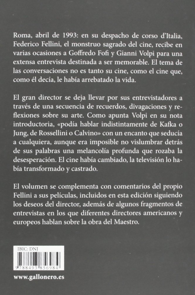 Roma, abril de 1993: en su despacho de Corso Italia, Federico Fellini, el monstruo sagrado del cine, recibe en varias ocasiones a Goffredo Fofi y Gianni Volpi para una extensa entrevista destinada a ser memorable. El tema de las conversaciones no es tanto su cine, como el cine que, como él decía, le había arrebatado la vida. El gran director se deja llevar por sus entrevistadores a través de una secuencia de recuerdos, divagaciones y reflexiones sobre su arte. Como apunta Volpi en su nota introductoria, «podía hablar indistintamente de Kafka o Jung, de Rossellini o Calvino» con un encanto que seducía a cualquiera, aunque era imposible no vislumbrar detrás de sus palabras una melancolía profunda que rozaba la desesperación. El cine había cambiado, la televisión lo había transformado y castrado. El volumen se complementa con comentarios del propio Fellini a sus películas, incluidos en esta edición siguiendo los deseos del director, además de algunos fragmentos de entrevistas en los que diferentes directores americanos y europeos hablan sobre la obra del Maestro.