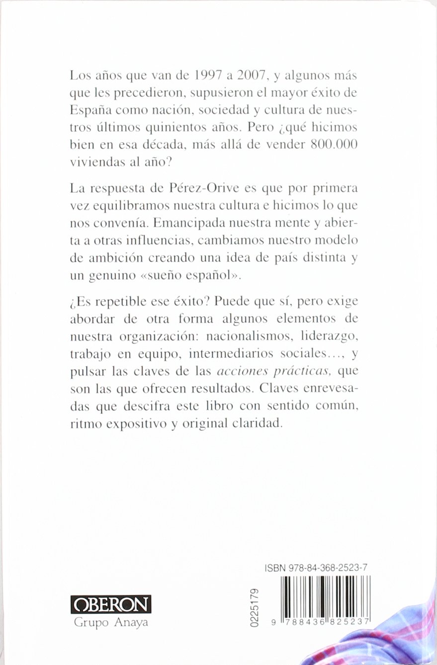 Los años que van de 1997 a 2007, y algunos más que les precedieron, supusieron el mayor éxito de España como nación, sociedad y cultura de nuestros últimos quinientos años. Pero ¿qué hicimos bien en esa década, más allá de vender 800.000 viviendas al año? La respuesta de Pérez-Orive es que por primera vez equilibramos nuestra cultura e hicimos lo que nos convenía. Emancipada nuestra mente y abierta a otras influencias, cambiamos nuestro modelo de ambición creando una idea de país distinta y un genuino «sueño español». ¿Es repetible ese éxito? Puede que sí, pero exige abordar de otra forma algunos elementos de nuestra organización: nacionalismos, liderazgo, trabajo en equipo, intermediarios sociales…, y pulsar las claves de las acciones prácticas, que son las que ofrecen resultados. Claves enrevesadas que descifra este libro con sentido común, ritmo expositivo y original claridad.