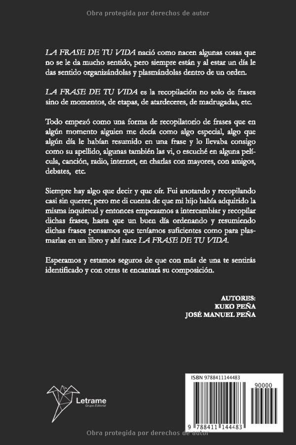 LA FRASE DE TU VIDA nació como nacen algunas cosas que no se le da mucho sentido, pero siempre están y al estar un día le das sentido organizándolas y plasmándolas dentro de un orden.LA FRASE DE TU VIDA es la recopilación no solo de frases sino de momentos, de etapas, de atardeceres, de madrugadas, etc.Todo empezó como una forma de recopilatorio de frases que en algún momento alguien me decía como algo especial, algo que algún día le habían resumido en una frase y lo llevaba consigo como su apellido, algunas también las vi, o escuché en alguna película, canción, radio, internet, en charlas con mayores, con amigos, debates, etc.Siempre hay algo que decir y que oír. Fui anotando y recopilando casi sin querer, pero me di cuenta de que mi hijo había adquirido la misma inquietud y entonces empezamos a intercambiar y recopilar dichas frases, hasta que un buen día ordenando y resumiendo dichas frases pensamos que teníamos suficientes como para plasmarlas en un libro y ahí nace LA FRASE DE TU VIDA.Esperamos y estamos seguros de que con más de una te sentirás identificado y con otras te encantará su composición.AUTORES:KUKO PEÑAJOSÉ MANUEL PEÑA