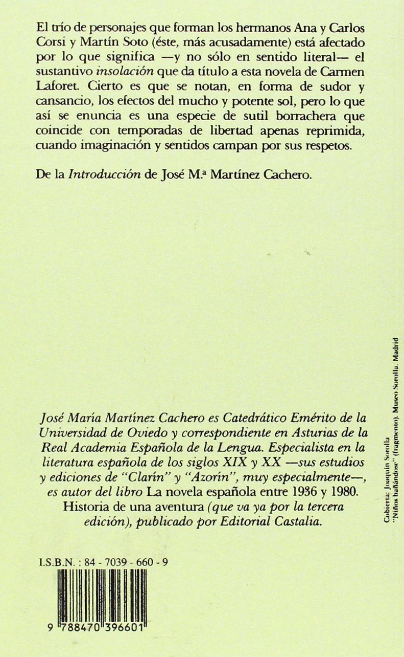 El trío de personajes que forman los hermanos Ana y Carlos Corsi y Martín Soto (éste, más acusadamente) está afectado por lo que significa -y no sólo en sentido literal- el sustantivo insolación que da título a esta novela de Carmen Laforet. Cierto es que notan, en forma de sudor y cansancio, los efectos del mucho y potente sol, pero lo que así se enuncia es una especie de sutil borrachera que coincide con temporadas de libertad apenas reprimida, cuando imaginación y sentidos campan por sus respetos.