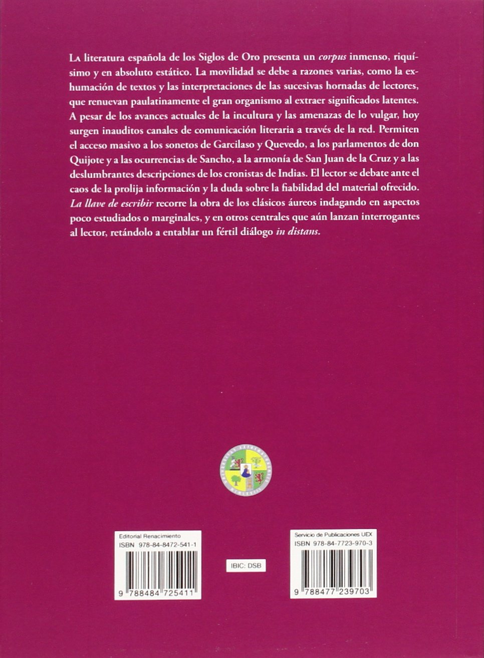 La literatura española de los Siglos de Oro presenta un corpus inmenso, riquísimo y en absoluto estático. La movilidad se debe a razones varias, como la exhumación de textos y las interpretaciones de las sucesivas hornadas de lectores, que renuevan paulatinamente el gran organismo al extraer significados latentes. A pesar de los avances actuales de la incultura y las amenazas de lo vulgar, hoy surgen inauditos canales de comunicación literaria a través de la red. Permiten el acceso masivo a los sonetos de Garcilaso y Quevedo, a los parlamentos de don Quijote y a las ocurrencias de Sancho, a la armonía de San Juan de la Cruz y a las deslumbrantes descripciones de los cronistas de Indias. El lector se debate ante el caos de la prolija información y la duda sobre la fiabilidad del material ofrecido. La llave de escribir recorre la obra de los clásicos áureos indagando en aspectos poco estudiados o marginales, y en otros centrales que aún lanzan interrogantes al lector, retándolo a entablar un fértil diálogo in distans. María Isabel López Martínez es doctora en Filología Hispánica y Profesora Titular de Teoría de la Literatura y Literatura Comparada. Desde 2010 ocupa el cargo de Vicerrectora de Extensión Universitaria de la Universidad de Extremadura. Ha escrito más de sesenta artículos de investigación y cinco monografías sobre poetas contemporáneos (Juan Ramón Jiménez, Miguel Hernández, Aleixandre, Neruda), sobre teoría literaria (Los clásicos de los Siglos de Oro y la inspiración poética; Tópicos literarios: Teoría y Crítica; La mujer ante el espejo. Un motivo literario y artístico) y sobre comparatismo (La poesía andalusí en la lírica contemporánea). Es autora de la biografía El General Infante: un liberal en España y en Bolivia. Ha recibido los siguientes premios de investigación: Especial de Doctorado, Monografías «Archivo Hispalense», Premio Internacional de Crítica Literaria «Amado Alonso», Accésit al Premio Nuestra América. Ha impartido cursos en universidades europeas (Marburg, Praga, Parma, Bérgamo, Estocolmo, Catania) y americanas (Michigan State University, Kalamazoo College, State University New York at Cortland, Syracuse University, Iowa State University).