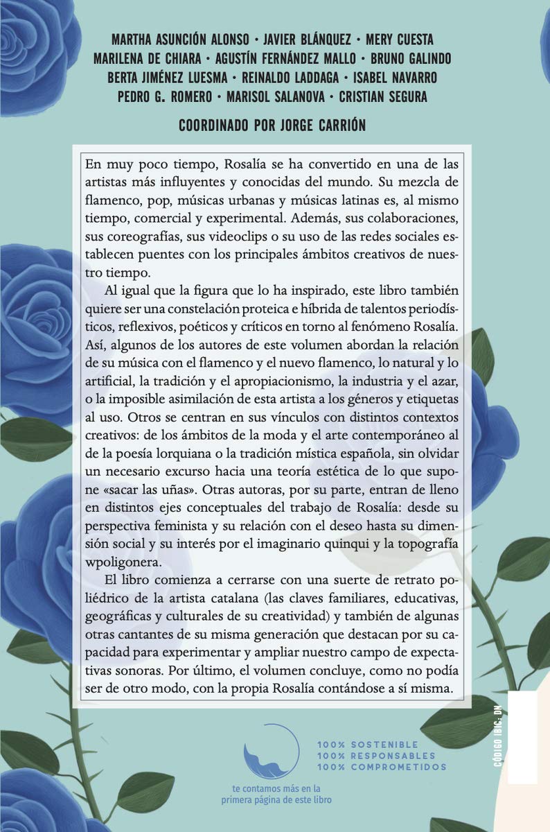 Martha Asunción Alonso · Javier Blánquez · Jorge Carrión · Mery Cuesta · Marilena de Chiara · Agustín Fernández Mallo · Bruno Galindo · Berta Jiménez Luesma · Reinaldo Laddaga · Isabel Navarro · Pedro G. Romero · Marisol Salanova · Cristian Segura. Coordinado por Jorge Carrión En muy poco tiempo, Rosalía se ha convertido en una de las artistas más influyentes y conocidas del mundo. Su mezcla de flamenco, pop, músicas urbanas y músicas latinas es, al mismo tiempo, comercial y experimental. Además, sus colaboraciones, sus coreografías, sus videoclips o su uso de las redes sociales establecen puentes con los principales ámbitos creativos de nuestro tiempo. Al igual que la figura que lo ha inspirado, este libro también quiere ser una constelación proteica e híbrida de talentos periodísticos, reflexivos, poéticos y críticos en torno al fenómeno Rosalía. Así, algunos de los autores de este volumen abordan la relación de su música con el flamenco y el nuevo flamenco, lo natural y lo artificial, la tradición y el apropiacionismo, la industria y el azar, o la imposible asimilación de esta artista a los géneros y etiquetas al uso. Otros se centran en sus vínculos con distintos contextos creativos: desde los ámbitos de la moda y el arte contemporáneo, al de la poesía lorquiana o la tradición mística española, sin olvidar un necesario excurso hacia una teoría estética de lo que supone «sacar las uñas». Otras autoras, por su parte, entran de lleno en distintos ejes conceptuales del trabajo de Rosalía: desde su perspectiva feminista y su relación con el deseo hasta su dimensión social y su interés por el imaginario quinqui y la topografía poligonera. El libro comienza a cerrarse con una suerte de retrato poliédrico de la artista catalana (las claves familiares, educativas, geográficas y culturales de su creatividad) y también de algunas otras cantantes de su misma generación que destacan por su capacidad para experimentar y ampliar nuestro campo de expectativas sonoras. Por último, el volumen concluye, como no podía ser de otro modo, con la propia Rosalía contándose a sí misma.