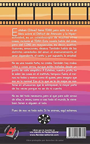 Esteban (Steve) tiene TDAH, pero este no es un libro sobre el Déficit de Atención y la Hiperactividad, es un caleidoscopio de muchas otras cosas, incluida el TDAH. Esta novela habla del cine, pero del CINE en mayúsculas, es decir, sueños, ilusiones, emociones, deseos. También habla de las distintas variedades del amor; el enamoramiento, el amor dependiente, el cariño y, por supuesto, la amistad. No es una novela ñoña, no creáis. También hay malos rollos y cosas serias, aunque estén tratadas desde un punto de vista simpático. A Esteban, nuestro prota, no le salen las cosas en el instituto, tampoco fuera, al menos no todas y menos como él quiere, pero imagino que eso es lo normal. Eso sí, lo que se le da mejor es meterse en situaciones que le sobrepasan, la mayor parte de las veces porque no se da ni cuenta. No es del todo necesario, pero sí que para salir airoso de ellas, a veces, como a casi todo el mundo, le viene bien tener a alguien al lado. Pues de eso va todo esto. Si te animas, aquí estamos.