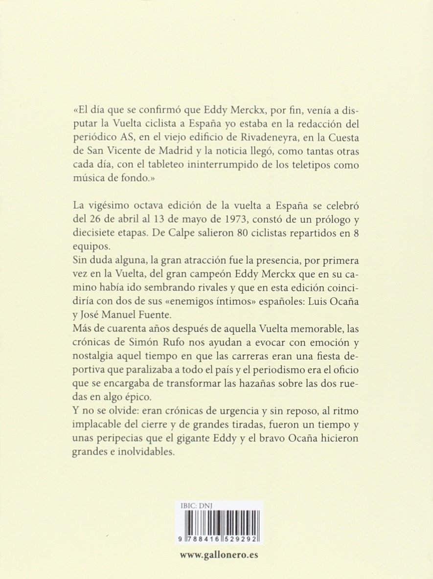 «El día que se confirmó que Eddy Merckx, por fin, venía a disputar la Vuelta ciclista a España yo estaba en la redacción del periódico AS, en el viejo edificio de Rivadeneyra, en la Cuesta de San Vicente de Madrid y la noticia llegó, como tantas otras cada día, con el tableteo ininterrumpido de los teletipos como música de fondo.» La vigésimo octava edición de la vuelta a España se celebró del 26 de abril al 13 de mayo de 1973, constando de un prólogo y diecisiete etapas. De Calpe salieron 80 ciclistas repartidos en 8 equipos. Sin duda alguna, la gran atracción fue la presencia, por primera vez en la Vuelta, del gran campeón Eddy Merckx que en su camino había ido sembrando rivales y que en esta edición de la Vuelta coincidiría con dos de sus «enemigos íntimos» españoles: Luis Ocaña y José Manuel Fuente. Cuarenta y tres años después de aquella Vuelta memorable, las crónicas de Simón Rufo nos ayudan a evocar con emoción y nostalgia aquel tiempo en que las carreras eran una fiesta deportiva que paralizaba a todo el país y el periodismo era el oficio que se encargaba de transformar las hazañas sobre las dos ruedas en algo épico. Y no se olvide: eran crónicas de urgencia y sin reposo, al ritmo implacable del cierre y de grandes tiradas, fueron un tiempo y unas peripecias que el gigante Eddy y el bravo Ocaña hicieron grandes e inolvidables. Simón Rufo (Madrid, 1943) empezó su carrera como periodista con 17 años en el diario Marca. Al fundarse AS en diciembre de 1967 pasó al nuevo periódico madrileño en el cual hizo buena parte de su carrera profesional, compatibilizándola durante muchos años con su trabajo como reportero, enviado especial y presentador de TVE y con la corresponsalía del periódico suizo Tages Anzeiger, de Zúrich. En sus últimos años en activo irrumpió con éxito como comentarista de ciclismo y fútbol en Radio España. Es autor de varios libros, todos con el ciclismo como telón de fondo: Cien años de ciclismo, Fuente, de la nada a la gloria, Campeones, Eddy Merckx y El libro de oro del ciclismo entre otros.