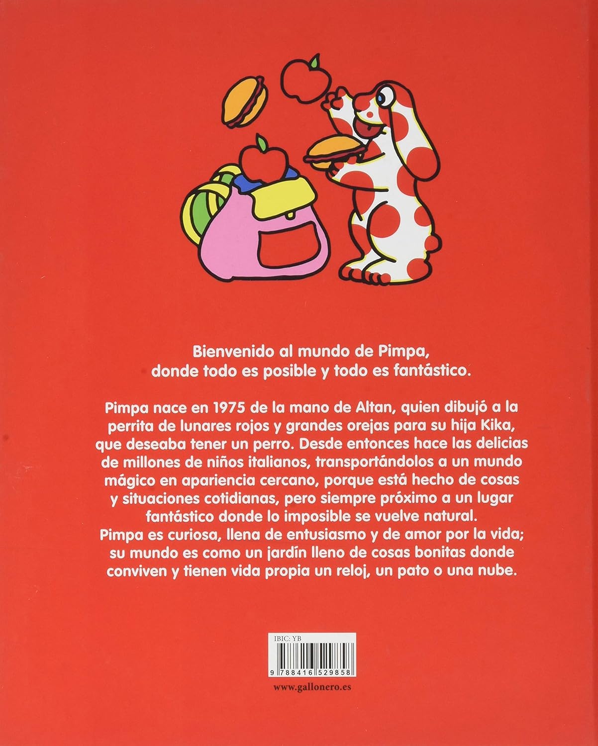 Bienvenido al mundo de Pimpa, donde todo es posible y todo es fantástico. Pimpa nace en 1975 de la mano de Altan, quien dibujó a la perrita de lunares rojos y grandes orejas para su hija Kika, que deseaba tener un perro. Desde entonces hace las delicias de millones de niños italianos, transportándolos a un mundo mágico en apariencia cercano, porque está hecho de cosas y situaciones cotidianas, pero siempre próximo a un lugar fantástico donde lo imposible se vuelve natural. Pimpa es curiosa, llena de entusiasmo y de amor por la vida; su mundo es como un jardín lleno de cosas bonitas donde conviven y tienen vida propia un reloj, un pato o una nube.