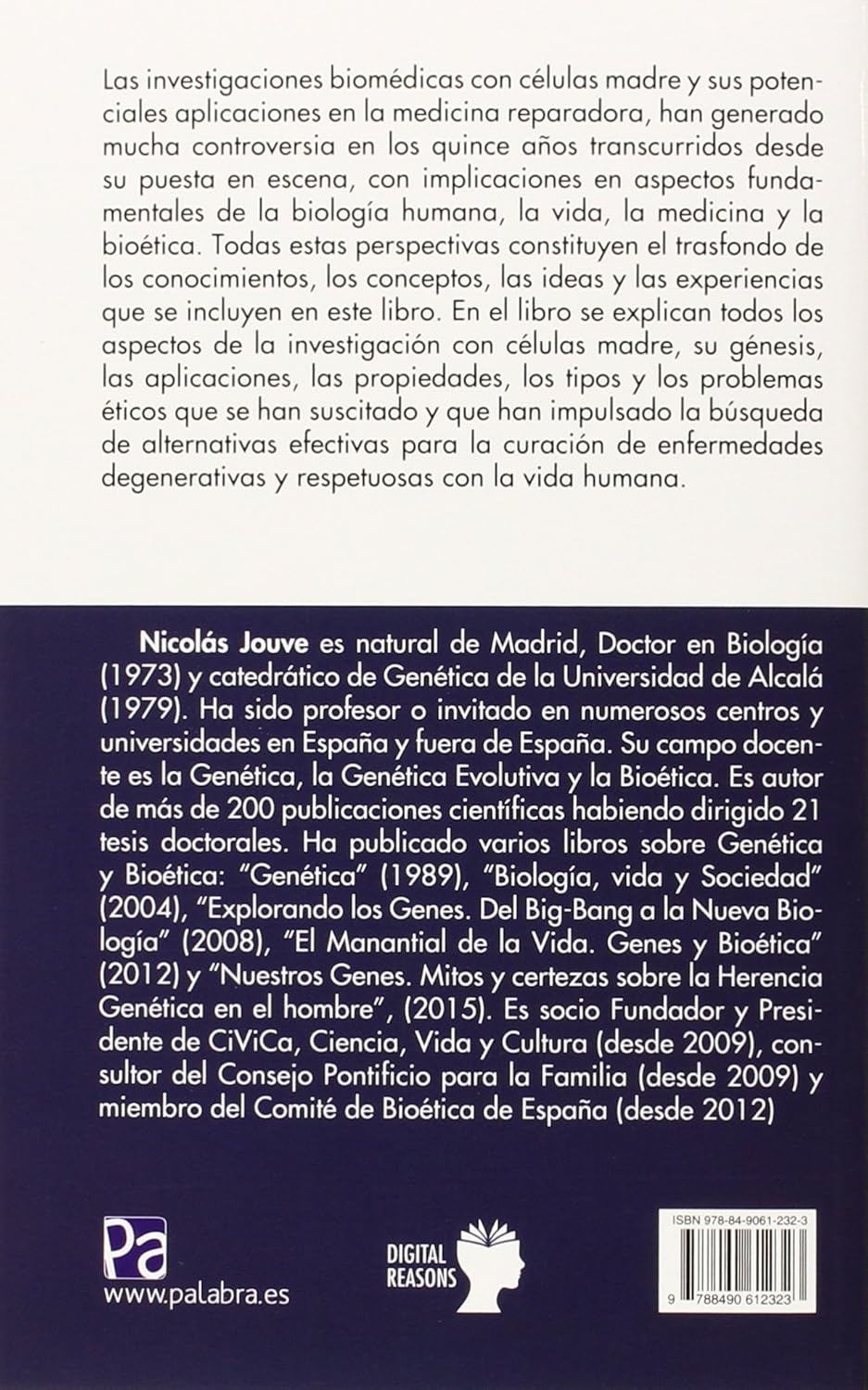 Las investigaciones biomédicas con células madre y sus potenciales aplicaciones en la medicina reparadora, han generado mucha controversia en los quince años transcurridos desde su puesta en escena, con implicaciones en aspectos fundamentales de la biología humana, la vida, la medicina y la bioética. Todas estas perspectivas constituyen el trasfondo de los conocimientos, los conceptos, las ideas y las experiencias que se incluyen en este libro. En el libro se explican todos los aspectos de la investigación con células madre, su génesis, las aplicaciones, las propiedades, los tipos y los problemas éticos que se han suscitado y que han impulsado la búsqueda de alternativas efectivas para la curación de enfermedades degenerativas y respetuosas con la vida humana. Nicolás Jouve es natural de Madrid, Doctor en Biología (1973) y catedrático de Genética de la Universidad de Alcalá (1979). Ha sido profesor o invitado en numerosos centros y universidades en España y fuera de España. Su campo docente es la Genética, la Genética Evolutiva y la Bioética. Es autor de más de 200 publicaciones científicas habiendo dirigido 21 tesis doctorales. Ha publicado varios libros sobre Genética y Bioética: “Genética” (1989), “Biología, vida y Sociedad” (2004), “Explorando los Genes. Del Big-Bang a la Nueva Biología” (2008), “El Manantial de la Vida. Genes y Bioética” (2012) y “Nuestros Genes. Mitos y certezas sobre la Herencia Genética en el hombre”, (2015). Es socio Fundador y Presidente de CiViCa, Ciencia, Vida y Cultura (desde 2009), consultor del Consejo Pontificio para la Familia (desde 2009) y miembro del Comité de Bioética de España (desde 2012).