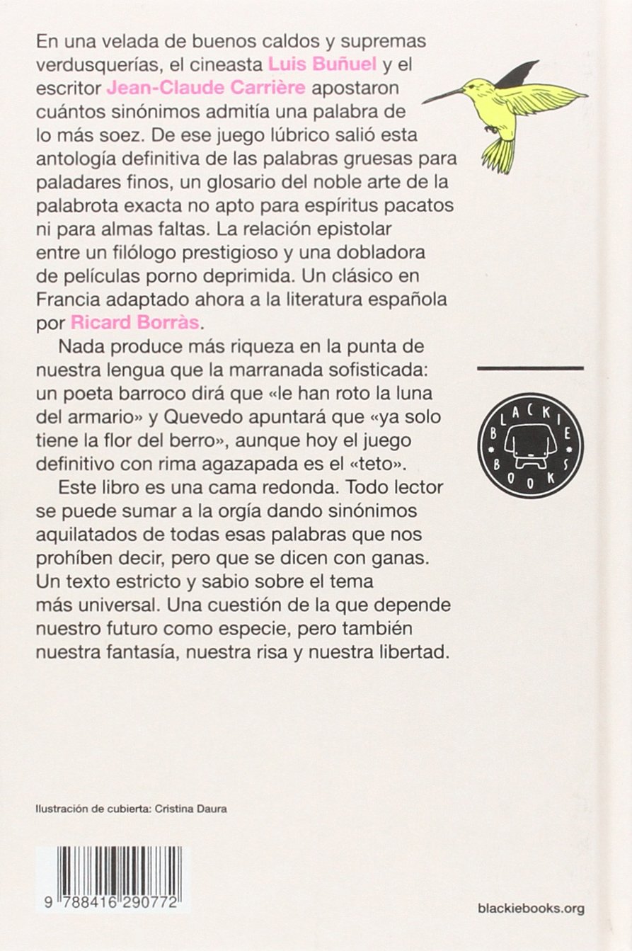 En una velada de buenos caldos y supremas verdusquerías, el cineasta Luis Buñuel y el escritor Jean-Claude Carrière apostaron cuántos sinónimos admitía una palabra de lo más soez. De ese juego lúbrico salió esta antología definitiva de las palabras gruesas para paladares finos, un glosario del noble arte de la palabrota exacta no apto para espíritus pacatos ni para almas faltas. La relación epistolar entre un filólogo prestigioso y una dobladora de películas porno deprimida. Un clásico en Francia adaptado ahora a la literatura española por Ricard Borràs. Nada produce más riqueza en la punta de nuestra lengua que la marranada sofisticada: un poeta barroco dirá que «le han roto la luna del armario» y Quevedo apuntará que «ya solo tiene la flor del berro», aunque hoy el juego definitivo con rima agazapada es el «teto». Este libro es una cama redonda. Todo lector se puede sumar a la orgía dando sinónimos aquilatados de todas esas palabras que nos prohíben decir, pero que se dicen con ganas. Un texto estricto y sabio sobre el tema más universal. Una cuestión de la que depende nuestro futuro como especie, pero también nuestra fantasía, nuestra risa y nuestra libertad.