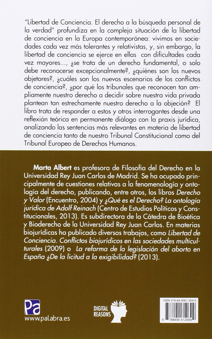 “Libertad de Conciencia. El derecho a la búsqueda personal de la verdad” profundiza en la compleja situación de la libertad de conciencia en la Europa contemporánea: vivimos en sociedades cada vez más tolerantes y relativistas, y, sin embargo, la libertad de conciencia se ejerce en ellas con dificultades cada vez mayores…, ¿se trata de un derecho fundamental, o solo debe reconocerse excepcionalmente?, ¿quiénes son los nuevos objetares?, ¿cuáles son los nuevos escenarios de los conflictos de conciencia?, ¿por qué los tribunales que reconocen tan ampliamente nuestro derecho a decidir sobre nuestra vida privada plantean tan estrechamente nuestro derecho a la objeción? El libro trata de responder a estos y otros interrogantes desde una reflexión teórica en permanente diálogo con la praxis jurídica, analizando las sentencias más relevantes en materia de libertad de conciencia tanto de nuestro Tribunal Constitucional como del Tribunal Europeo de Derechos Humanos. Marta Albert es profesora de Filosofía del Derecho en la Universidad Rey Juan Carlos de Madrid. Se ha ocupado principalmente de cuestiones relativas a la fenomenología y ontología del derecho, publicando, entre otros, los libros Derecho y Valor (Encuentro, 2004) y ¿Qué es el Derecho? La ontología jurídica de Adolf Reinach (Centro de Estudios Políticos y Constitucionales, 201 3). Es subdirectora de la Cátedra de Bioética y Bioderecho de la Universidad Rey Juan Carlos. En materias biojurídicas ha publicado diversos trabajos, como Libertad de Conciencia. Conflictos biojurídicos en las sociedades multiculturales (2009) o La reforma de la legislación del aborto en España ¿De la licitud a la exigibilidad? (2013).