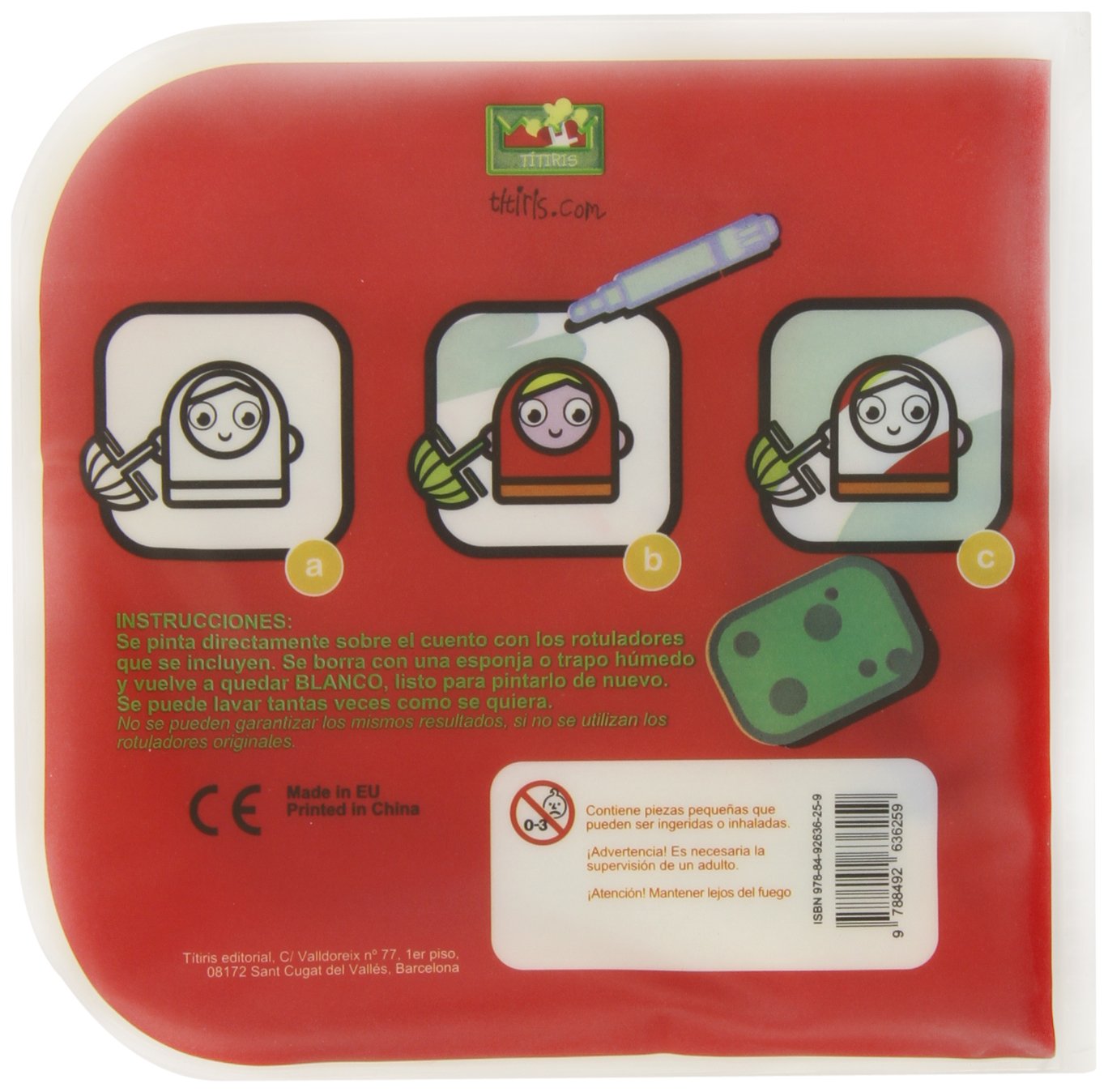 El libro plástico de la Caperucita is designed for children ages 1 to 4 to help them learn to color within the lines and without making a mess. The book comes in a transparent plastic case, making it easy to take anywhere. There are four colored felt-tip pens and a sponge included, which can easily be cleaned with a towel so that the children and color the pictures again and again.