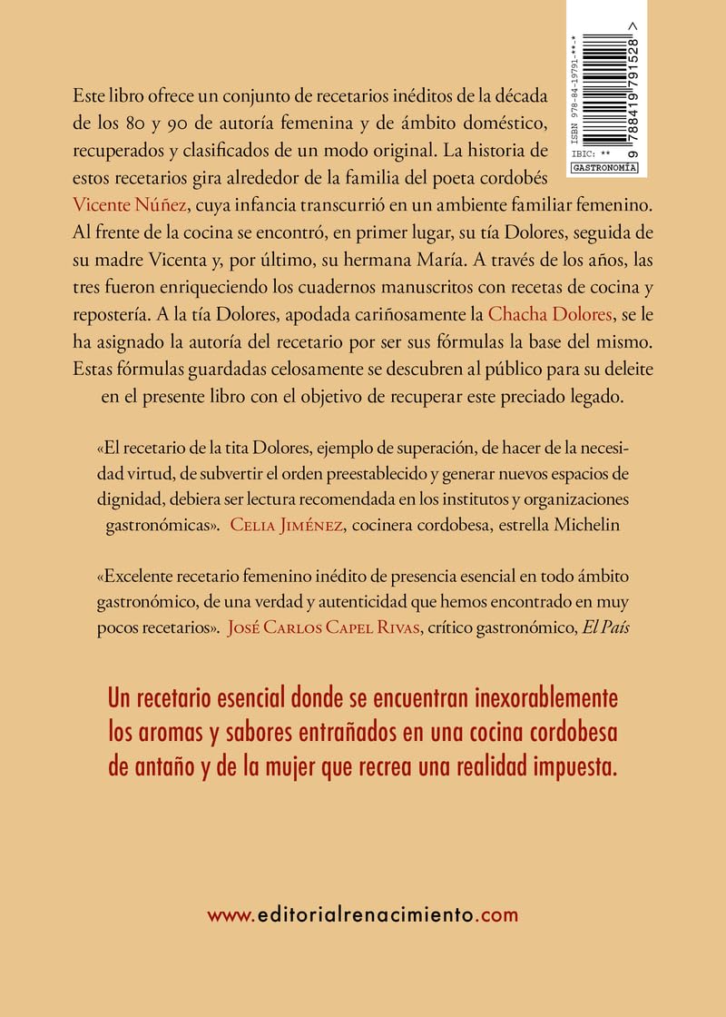 Este libro ofrece un conjunto de recetarios inéditos de la década de los 80 y 90 de autoría femenina y de ámbito doméstico, recuperados y clasificados de un modo original. La historia de estos recetarios gira alrededor de la familia del poeta cordobés Vicente Núñez, cuya infancia transcurrió en un ambiente familiar femenino. Al frente de la cocina se encontró, en primer lugar, su tía Dolores, seguida de su madre Vicenta y, por último, su hermana María. A través de los años, las tres fueron enriqueciendo los cuadernos manuscritos con recetas de cocina y repostería. A la tía Dolores, apodada cariñosamente la Chacha Dolores, se le ha asignado la autoría del recetario por ser sus fórmulas la base del mismo. Estas fórmulas guardadas celosamente se descubren al público para su deleite en el presente libro con el objetivo de recuperar este preciado legado. «El recetario de la tita Dolores, ejemplo de superación, de hacer de la necesidad virtud, de subvertir el orden preestablecido y generar nuevos espacios de dignidad, debiera ser lectura recomendada en los institutos y organizaciones gastronómicas». Celia Jiménez, cocinera cordobesa, estrella Michelin «Excelente recetario femenino inédito de presencia esencial en todo ámbito gastronómico, de una verdad y autenticidad que hemos encontrado en muy pocos recetarios». José Carlos Capel Rivas, crítico gastronómico, El País Un recetario esencial donde se encuentran inexorablemente los aromas y sabores entrañados en una cocina cordobesa de antaño y de la mujer que recrea una realidad impuesta. Vicenta María Márquez Núñez (Aguilar de la Frontera, Córdoba, 1960). Cursó sus estudios administrativos en Formación Profesional en Montilla. Ha trabajado tanto en el ámbito privado como público. Y desde el año 2002, que se constituyó la fundación Vicente Núñez, trabaja como Directora-Gerente. Entre los objetivos de la fundación está salvaguardar el legado humano y literario de la obra del poeta Vicente Núñez, poeta aguilarense. Celia Jiménez Caballero (introducción) (Córdoba, 1976), primera cocinera andaluza que consigue una estrella Michelin, como Jefe de Cocina del Restaurante El Lago (Marbella) en el año 2005. Estuvo a cargo de la Dirección Técnica de Cocina de la Cátedra de Gastronomía de Andalucía. En 2015 abre las puertas de Celia Jiménez Restaurante en Córdoba. Eduardo Martín Mazas (prólogo) (Valcarca, Huesca, 1958 - Madrid, 2023), destacado profesional de la hostelería española, gestor de restauración, bibliófilo e investigador gastronómico, dedicó su vida al arte, a su profesión y a la investigación culinaria, que complementó con su afición por los libros antiguos y el coleccionismo temático gastronómico. Ha escrito, entre otras publicaciones, los libros Teodoro Bardají Mas. El Precursor de la Cocina Moderna en España (2008) y La Colección Gastronómica Sebastián Damunt-Un Proyecto de Museo (2019). José Carlos Capel Rivas (prólogo) (Madrid, 1945), gastrónomo y crítico español, economista de profesión y autor de varios libros sobre tradición culinaria, guías de viaje y otras publicaciones sobre alimentación. Forma parte de la Real Academia de Gastronomía y de la Academia Internacional del Vino. Además, se dedica, desde hace más de treinta años, al periodismo gastronómico en el diario El País. Javier García del Olmo (prólogo) (Almoguera, Guadalajara, 1948), prolífico diseñador gráfico, coleccionista y bibliófilo de todo lo relacionado con las artes del libro. Con experiencia de 50 años en artes gráficas, publicidad y diseño editorial, ha diseñado los libros de Eduardo Martín Mazas sobre Bardají y Damunt, ahora ya dos clásicos de la bibliografía gastronómica contemporánea del siglo xx. Silvia Teresita Acuña Castillo (prólogo) (Santiago del Estero, Argentina, 1965), doctora en Informática por la Universidad Politécnica de Madrid (2002) y profesora de la Universidad Autónoma de Madrid (desde 2003). Vivió y aprendió junto a Eduardo Martín Mazas la pasión por la cocina y la historia de la gastronomía.