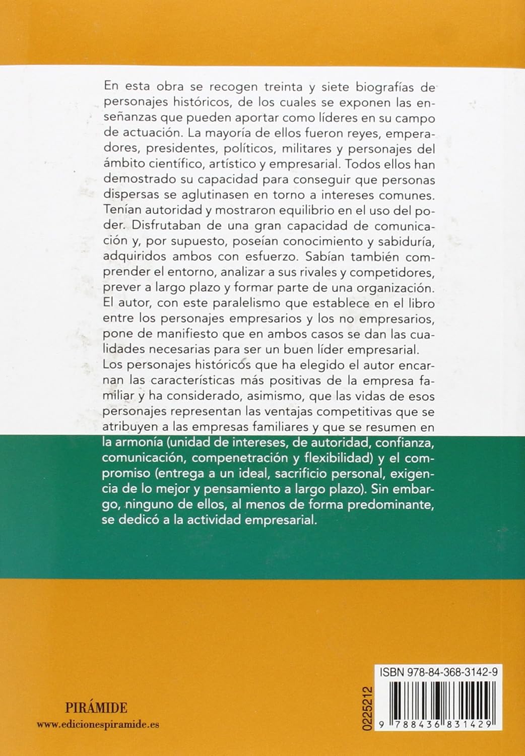 En esta obra se recogen treinta y siete biografías de personajes históricos, de los cuales se exponen las enseñanzas que pueden aportar como líderes en su campo de actuación. La mayoría de ellos fueron reyes, emperadores, presidentes, políticos, militares y personajes del ámbito científico, artístico y empresarial. Todos ellos han demostrado su capacidad para conseguir que personas dispersas se aglutinasen en torno a intereses comunes. Tenían autoridad y mostraron equilibrio en el uso del poder. Disfrutaban de una gran capacidad de comunicación y, por supuesto, poseían conocimiento y sabiduría, adquiridos ambos con esfuerzo. Sabían también comprender el entorno, analizar a sus rivales y competidores, prever a largo plazo y formar parte de una organización. El autor, con este paralelismo que establece en el libro entre los personajes empresarios y los no empresarios, pone de manifiesto que en ambos casos se dan las cualidades necesarias para ser un buen líder empresarial. Los personajes históricos que ha elegido el autor encarnan las características más positivas de la empresa familiar y ha considerado, asimismo, que las vidas de esos personajes representan las ventajas competitivas que se atribuyen a las empresas familiares y que se resumen en la armonía (unidad de intereses, de autoridad, confianza, comunicación, compenetración y flexibilidad) y el compromiso (entrega a un ideal, sacrificio personal, exigencia de lo mejor y pensamiento a largo plazo). Sin embargo, ninguno de ellos, al menos de forma predominante, se dedicó a la actividad empresarial.