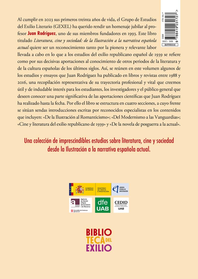 Al cumplir en 2023 sus primeros treinta años de vida, el Grupo de Estudios del Exilio Literario (GEXEL) ha querido rendir un homenaje jubilar al profesor Juan Rodríguez, uno de sus miembros fundadores en 1993. Este libro titulado Literatura, cine y sociedad: de la Ilustración a la narrativa española actual quiere ser un reconocimiento tanto por la pionera y relevante labor llevada a cabo en lo que a los estudios del exilio republicano español de 1939 se refiere como por sus decisivas aportaciones al conocimiento de otros periodos de la literatura y de la cultura españolas de los últimos siglos. Así, se reúnen en este volumen algunos de los estudios y ensayos que Juan Rodríguez ha publicado en libros y revistas entre 1988 y 2016, una recopilación representativa de su trayectoria profesional y vital que creemos útil y de indudable interés para los estudiantes, los investigadores y el público general que deseen conocer una parte significativa de las aportaciones científicas que Juan Rodríguez ha realizado hasta la fecha. Por ello el libro se estructura en cuatro secciones, a cuyo frente se sitúan sendas introducciones escritas por reconocidos especialistas en los contenidos que incluyen: «De la Ilustración al Romanticismo»; «Del Modernismo a las Vanguardias»; «Cine y literatura del exilio republicano de 1939» y «De la novela de posguerra a la actual». Una colección de imprescindibles estudios sobre literatura, cine y sociedad desde la Ilustración a la narrativa española actual. El Grupo de Estudios del Exilio Literario (GEXEL) es un grupo de investigación adscrito al Departamento de Filología Española de la Universitat Autònoma de Barcelona e integrado en el Centre d’Estudis sobre Dictadures i Democràcies (CEDID) de la UAB que en 2023 celebra sus primeros treinta años de vida. Creado por Manuel Aznar Soler, su director desde 1993 hasta su jubilación en 2021, se constituyó formalmente con la aprobación por parte de sus miembros fundadores de un Manifiesto que consideramos plenamente vigente: El Grupo de Estudios del Exilio Literario (GEXEL) está compuesto por profesores titulares, becarios, investigadores que preparan su tesis doctoral e investigadores que preparan su trabajo de doctorado. Se constituye como un grupo de investigación adscrito al Departamento de Filología Española de la Universitat Autònoma de Barcelona y se plantea como tarea prioritaria y urgente la reconstrucción de la memoria histórica, cultural y literaria del exilio español de 1939, tarea de evidentes implicaciones éticas y políticas. Cuando la Guerra Civil ya no es para la mayoría de la sociedad española sino un capítulo más en la historia del siglo xx, constatamos que en nuestra literatura parece no haber terminado. El mejor homenaje a un escritor, vivo o muerto, consiste en leerlo, tarea particularmente difícil en el caso del exilio. Porque, al margen de aquellos autores cuya obra ha sido total o parcialmente recuperada, una gran parte de nuestros escritores exiliados nos son aún hoy inaccesibles, ya que muchos de sus libros no figuran en bibliotecas públicas, catálogos editoriales o librerías. En suma, que la mayoría de nuestros escritores exiliados, a quienes la política del franquismo condenó al silencio y al olvido, siguen siendo escritores ignorados. Apelamos a la conciencia y sensibilidad de la sociedad española para que repare esta injusticia y salde, de una vez por todas y con la debida dignidad, esa deuda moral contraída con aquellos españoles que pagaron con el destierro forzoso su fidelidad a la legalidad democrática republicana y su defensa de la libertad de nuestra cultura. Apelamos a la necesidad y urgencia de recuperar este patrimonio cultural y literario. Olvidarse del exilio, ahora que aún puede reconstruirse buena parte de su historia documental y literaria, sería su segunda muerte, acaso ya definitiva. Estamos firmemente convencidos de que la recuperación de nuestro exilio debería haber sido una cuestión de política de Estado y de que, salvo iniciativas puntuales cuyo mérito sería injusto no reconocer, el exilio constituye una asignatura pendiente de la política cultural de la España democrática y, especialmente, de un gobierno cuyo partido luchó en defensa de aquellos mismos valores. Estamos firmemente convencidos de que la recuperación del exilio no puede quedar abandonada únicamente a la iniciativa privada, por bien intencionada que ésta sea, y por ello recabamos para nuestro proyecto la ayuda de las instituciones del Estado: Gobierno Central, Gobiernos Autonómicos, Diputaciones Provinciales y Ayuntamientos. Nos gustaría que el pueblo español pudiese leer lo antes posible a los escritores del exilio cuyas obras aún no han sido reeditadas y que esta literatura desterrada regresara a su tierra y a su público, es decir, estuviera a su alcance en las librerías o bibliotecas sin otro criterio que el de su calidad. Bellaterra, 16 de enero de 1993 Juan Rodríguez (Barcelona, 1961), doctor en Filología Hispánica y profesor titular de Literatura Española en la Universitat Autònoma de Barcelona, es miembro del GEXEL desde su fundación en 1993. Su investigación se ha centrado en la literatura española contemporánea, con especial atención a la narrativa del siglo XX, tanto del interior como del exilio. Ha publicado artículos sobre la obra de diversos autores, desde José Cadalso o El Censor hasta Juan José Millás, pasando por José Martínez Ruiz, Rafael Altamira, Pío Baroja, Miguel Hernández, Cecilio Benítez de Castro, Max Aub, Paulino Masip, Jorge Semprún, José Miguel García Ascot, Luis Goytisolo, Juan Marsé o Antonio Muñoz Molina. Miembro fundador del Taller de Investigaciones Valleinclanianas (UAB), ha publicado también, además de varios trabajos sobre el autor, una edición anotada de Tirano Banderas (Barcelona, 1994; actualizada en 2012 y publicada en http://www.tiranobanderas.es/) y es secreta