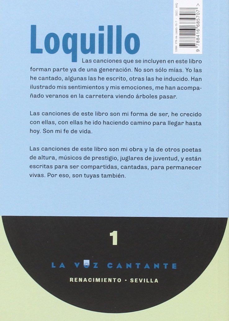Las canciones que se incluyen en este libro forman parte ya de una generación. No son sólo mías. Yo las he cantado, algunas las he escrito, otras las he inducido. Han ilustrado mis sentimientos y mis emociones, me han acompañado veranos en la carretera viendo árboles pasar. Las canciones de este libro son mi forma de ser, he crecido con ellas, con ellas he ido haciendo camino para llegar hasta hoy. Son mi fe de vida. Las canciones de este libro son mi obra y la de otros poetas de altura, músicos de prestigio, juglares de juventud, y están escritas para ser compartidas, cantadas, para permanecer vivas. Por eso, son tuyas también.
