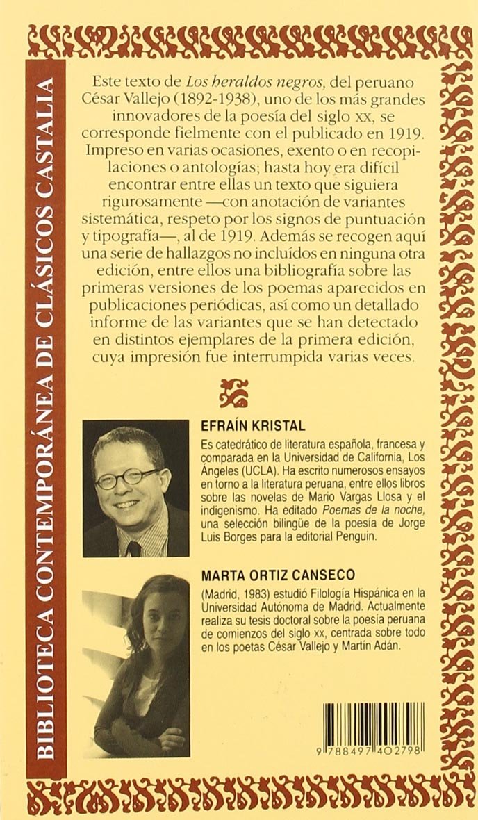 Este texto de LOS HERALDOS NEGROS, del peruano César Vallejo (1892-1938), uno de los más grandes innovadores de la poesía del siglo XX, se corresponde fielmente con el publicado en 1919. Impreso en varias ocasiones, exento o en recopilaciones o antologías, hasta hoy era difícil encontrar entre ellas un texto que siguiera rigurosamente con anotación de variantes sistemática, respeto por los signos de puntuación y tipografía al de 1919. Además se recogen aquí una serie de hallazgos no incluídos en ninguna otra edición, entre ellos una bibliografía sobre las primeras versiones de los poemas aparecidos en publicaciones periódicas, así como un detallado informe de las variantes que se han detectado en distintos ejemplares de la primera edición, cuya impresión fue interrumpida varias veces.